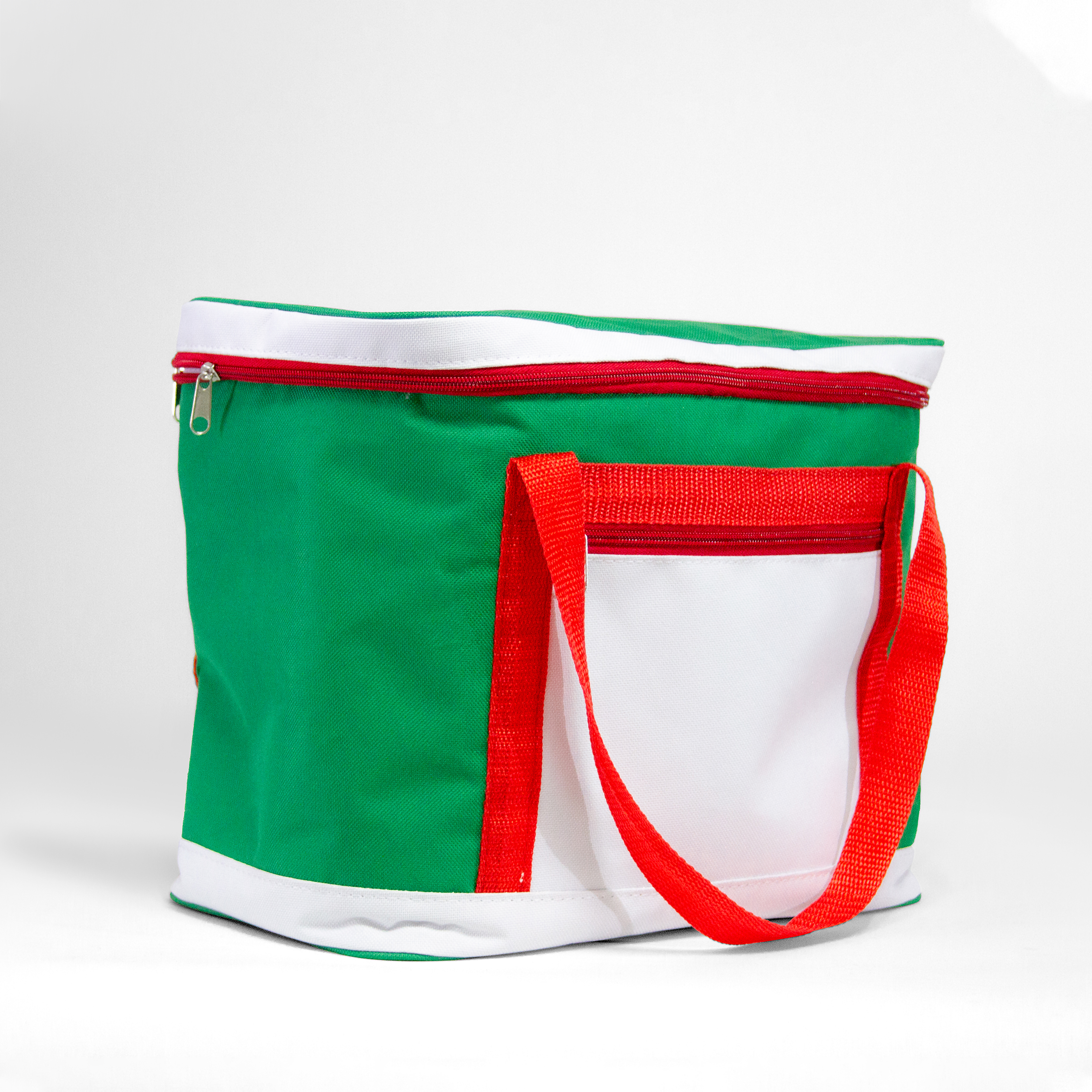QATAR Hielera tricolor de poliéster, con bolsa interior plastificada y compartimento frontal. Cuenta con asas de sujeción.