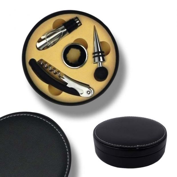 Estuche para Vinos Redondo Estuche para Vinos Redondo Inlcuye Sacacorchos,Tapon para Botella, Vertedor y Cortagotas
