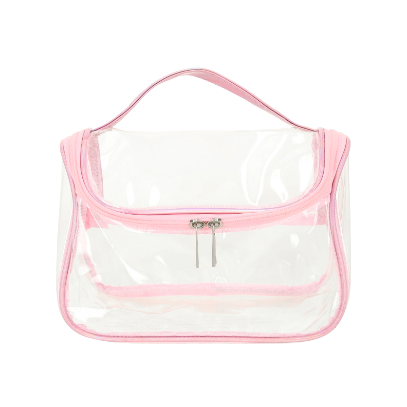 LUCY Cosmetiquera de plástico transparente, costuras en color rosa, doble cierre y asa.