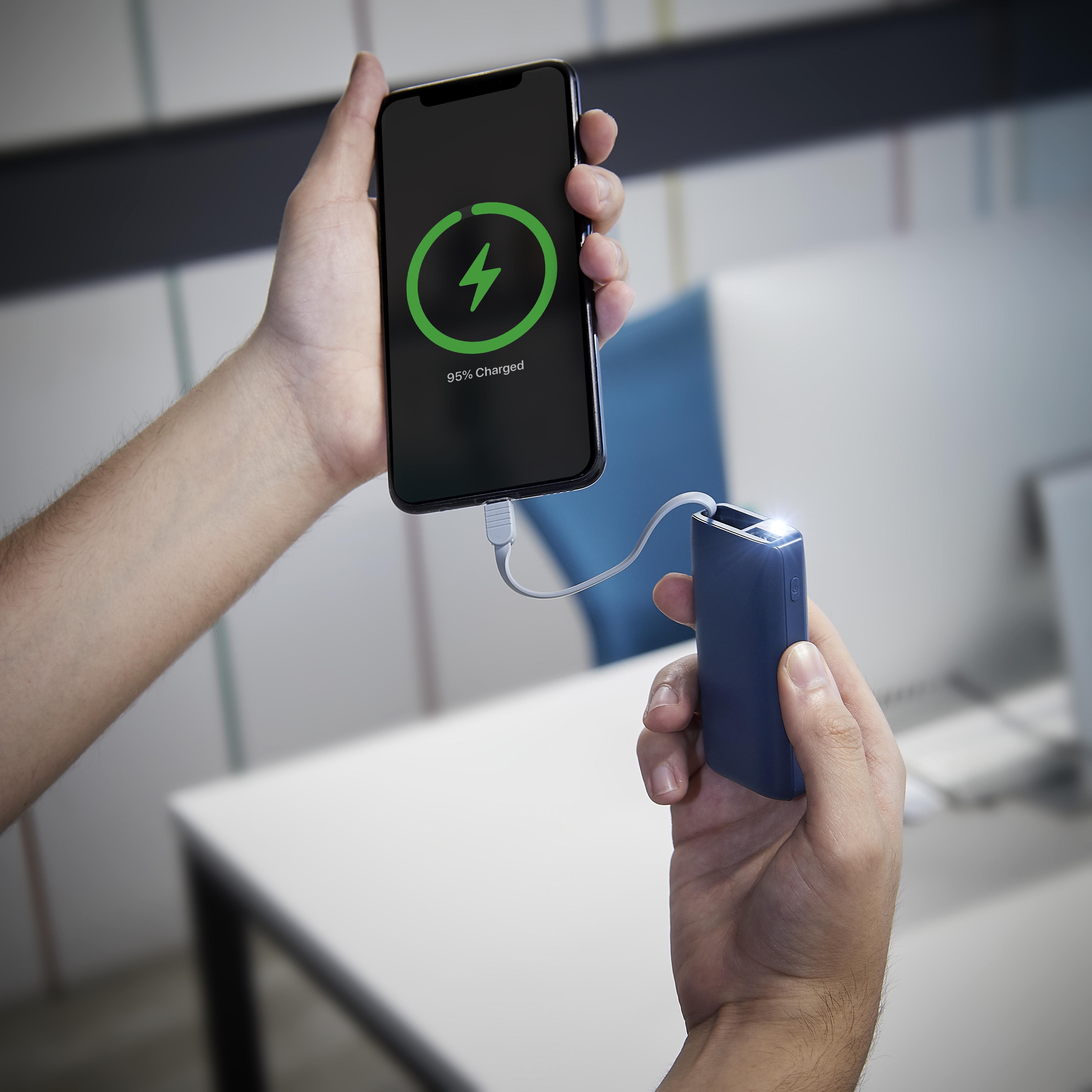 POWER BANK IKTRON - Batería auxiliar para smartphone, capacidad 5,000 mAh. Contiene 1 puerto de entrada tipo C, compatible para carga de dispositivos y recarga de la batería y 1 puerto de salida USB para carga de dispositivos. Adicional 1 cable integrado tipo C. Incluye lámpara con luz LED, display indicador de carga, cable con conector tipo C y caja individual.