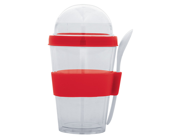 FROYO - Vaso de doble pared de plástico con cuchara. CAP. 300 ml. Presentación: caja en color blanco. *BPA FREE.