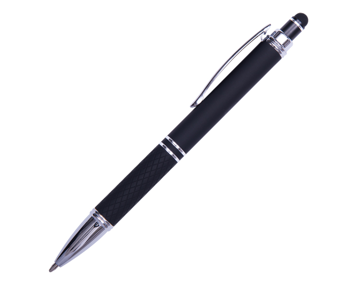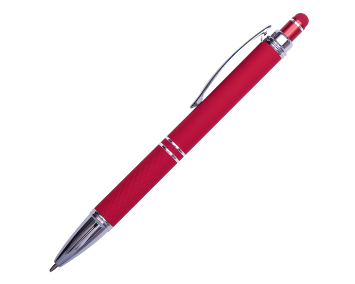STEVIA DE TINTA AZUL - Bolígrafo de aluminio de tinta azul, con recubrimiento de goma, parte inferior con textura. Detalles y clip metálico. Punta touch y mecanismo de click.
