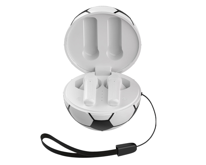 GOAL - Audífonos inalámbricos Bluetooth con estuche de carga de 220 mAh en forma de balón de fútbol soccer. Cuentan con función de manos libres, alcance de hasta 10 m, entrada tipo C (incluye cable) y correa para transporte. Duración aprox. de reproducción de 4 hrs. Tiempo de carga 2 hrs. Compatibles con dispositivos Android e iOS. Presentación: Caja a color.