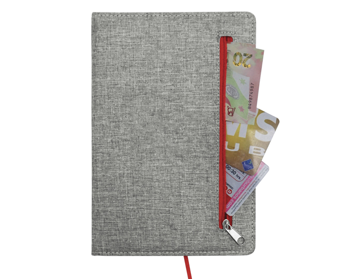 ZIPPER - Libreta vertical A5 de tela con bolsa al frete y detalle de cremallera en color. La libreta es de 80 hojas rayadas (160 páginas). Incluye listón separador del mismo color que el cierre.