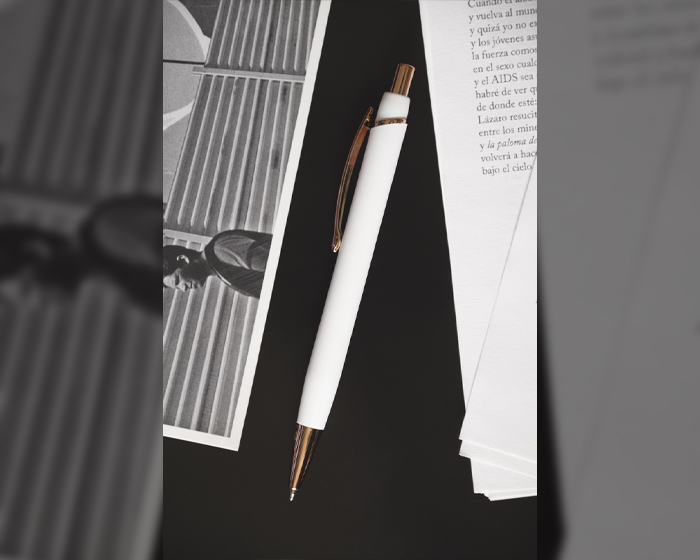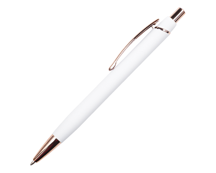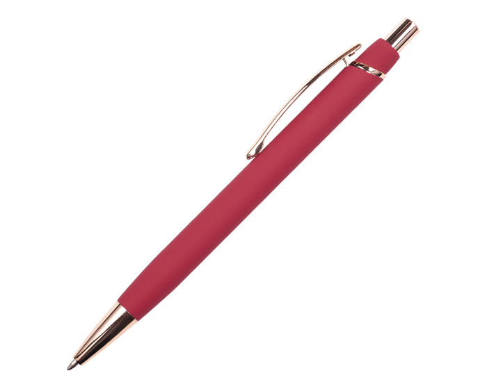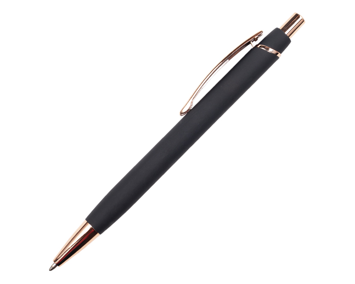 ARIANA - Bolígrafo de aluminio con mecanismo de click, acabado de goma suave al tacto y detalles en oro rosa (punta, clip y botón). Al grabar en laser CO2, destapa en color oro rosa.