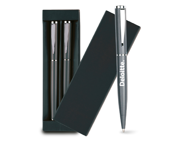 MATERIAL: Bolígrafo: Acero Inoxidable // Estuche: Cartón MEDIDAS: Bolígrafo: 13.5 x 0.8 cm // Estuche: 16.7 x 5.2 cm IMPRESION: GL MED. EMPAQUE: 56.5 x 39 x 25 cm PESO EMPAQUE: 15.5kg PIEZAS EMPAQUE: 200