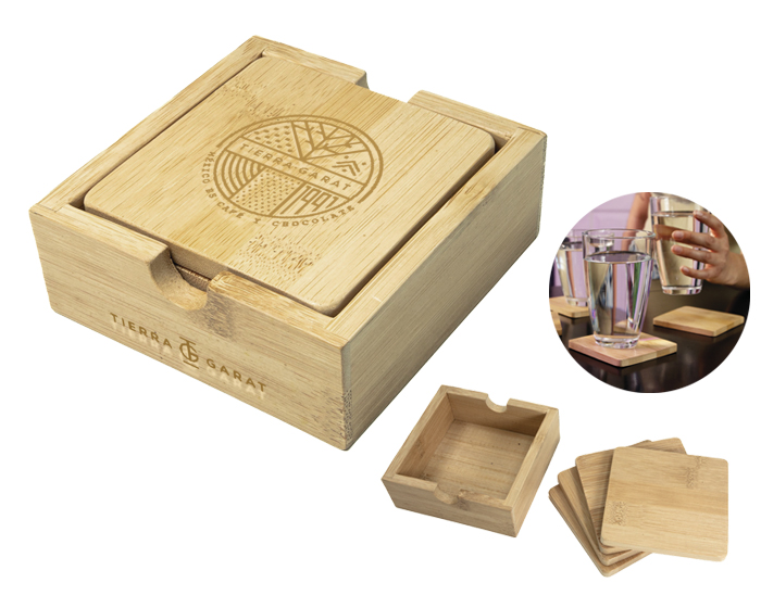 MATERIAL: Bambú MEDIDAS: 11.4 x 11.4 cm IMPRESION: GL SE MED. EMPAQUE: 50 x 25.5 x 26.5 cm PESO EMPAQUE: 14.65 kg PIEZAS EMPAQUE: 40