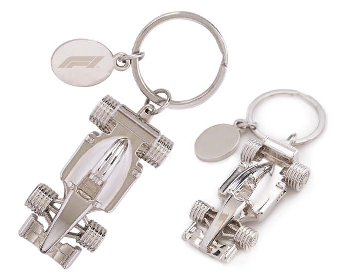 DIEGO - Llavero metálico en forma de auto de carreras con placa de aleación de zinc y arillo reforzado. Presentación: Caja individual de kraft.