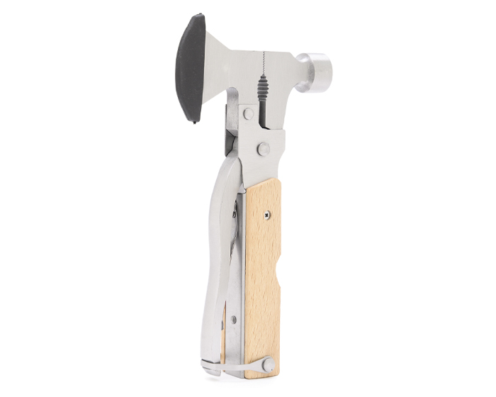 LEÑADOR - Multi herramienta plegable tipo martillo con mango de madera y 14 funciones: Hacha, alicatas redondas, alicatas planas, martillo, navaja de sierra con lima, desarmador plano pequeño, destapador de botellas, llave múltiple, desarmador plano grande, descamador de pescado, desarmador de cruz, navaja, cortador de alambre y arillo para colgar. Presentación: caja de regalo a color.