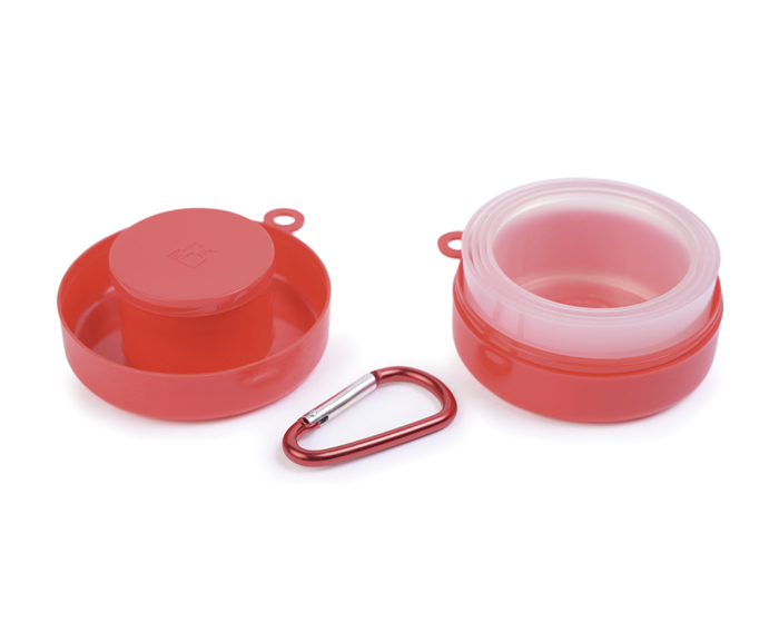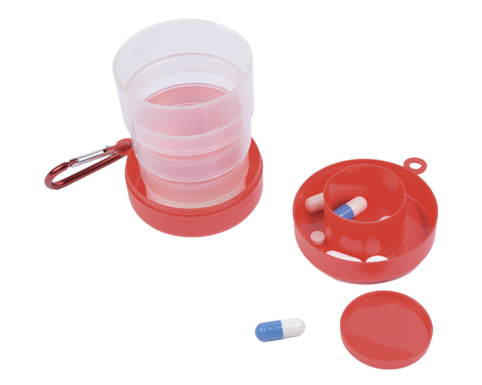 PILDORA - Vaso plegable de 150 ml. con estuche que funciona como pastillero que incluye tapa y argolla metálica para transportar.