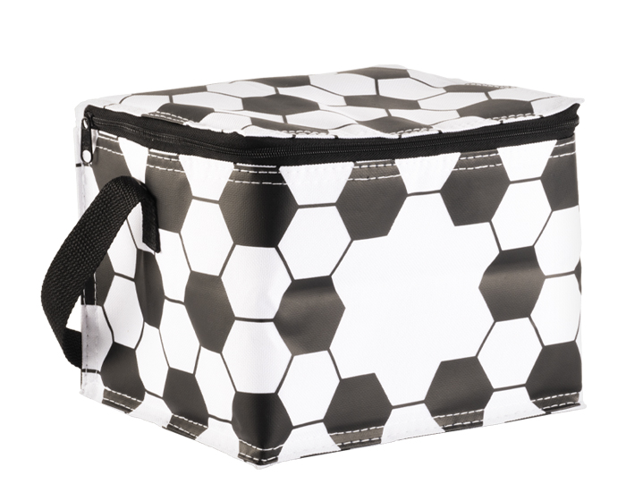 CASCARITA - Lonchera / Hielera rectangular con diseño de balón de fútbol soccer, tiene cubierta cosida e interior termosellado en plástico anti escurrimiento. Cuenta con cierre y correa larga. CAP. 6 latas.