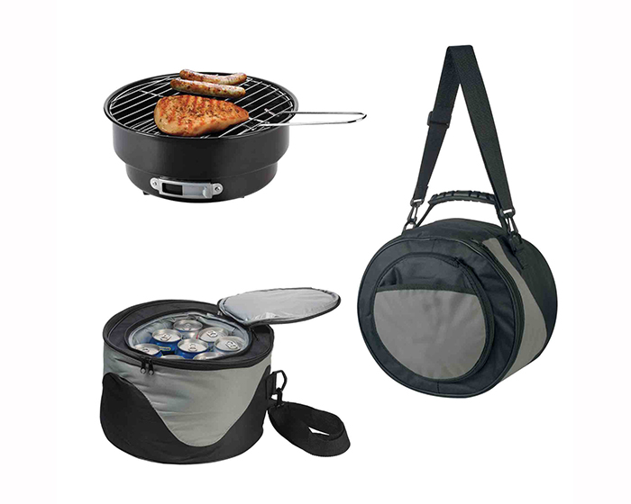 VID - Asador portátil con parrilla, el cual cuenta con mango para protegerse del calor. Incluye recipiente para carbón con soporte, así como estuche térmico que sirve también como hielera, con capacidad para 8 latas. Presentación: caja de color.