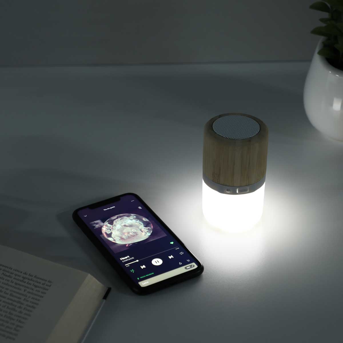 BOCINA LÁMPARA LAON - Bocina bluetooth con lámpara. Batería recargable. Reproducción de música de 2 hrs aproximadamente. Tiempo de carga de 2 hrs. Rango de conexión de 10 metros. Lámpara de luz LED con 3 niveles de luz. Incluye cable cargador tipo C.