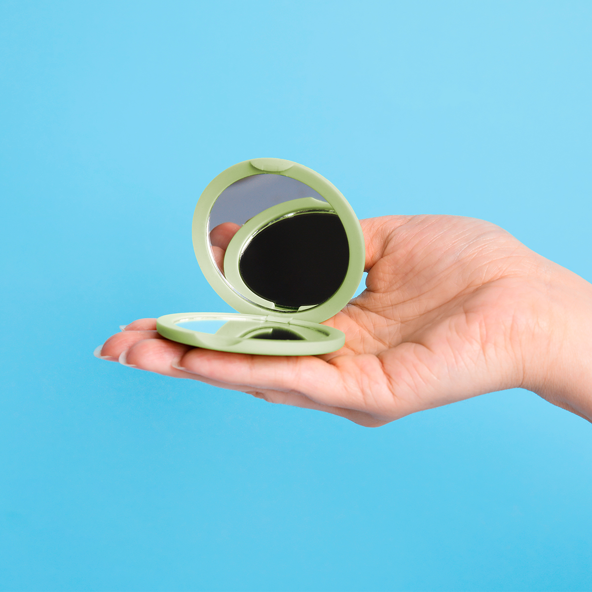Espejo Buir. - Espejo circular fabricado en fibra de trigo y plástico PP. Con espejo en ambas tapas. Gracias a su tamaño y a que es bastante ligero, es ideal para llevarlo contigo todos los días.