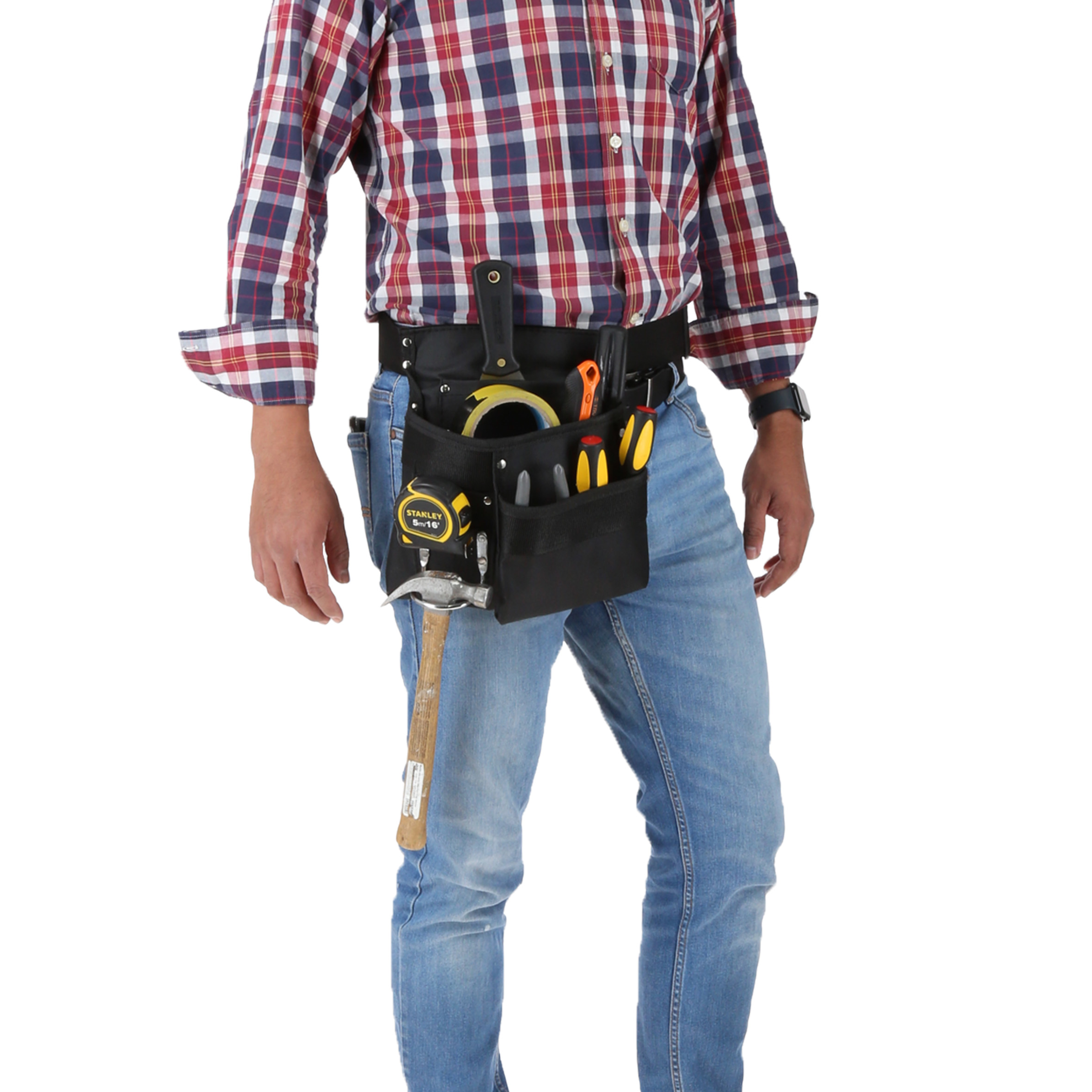 DREW Cinturón porta herramientas con 4 compartimentos, 1 porta martillo, correa ajustable y broche de seguridad.