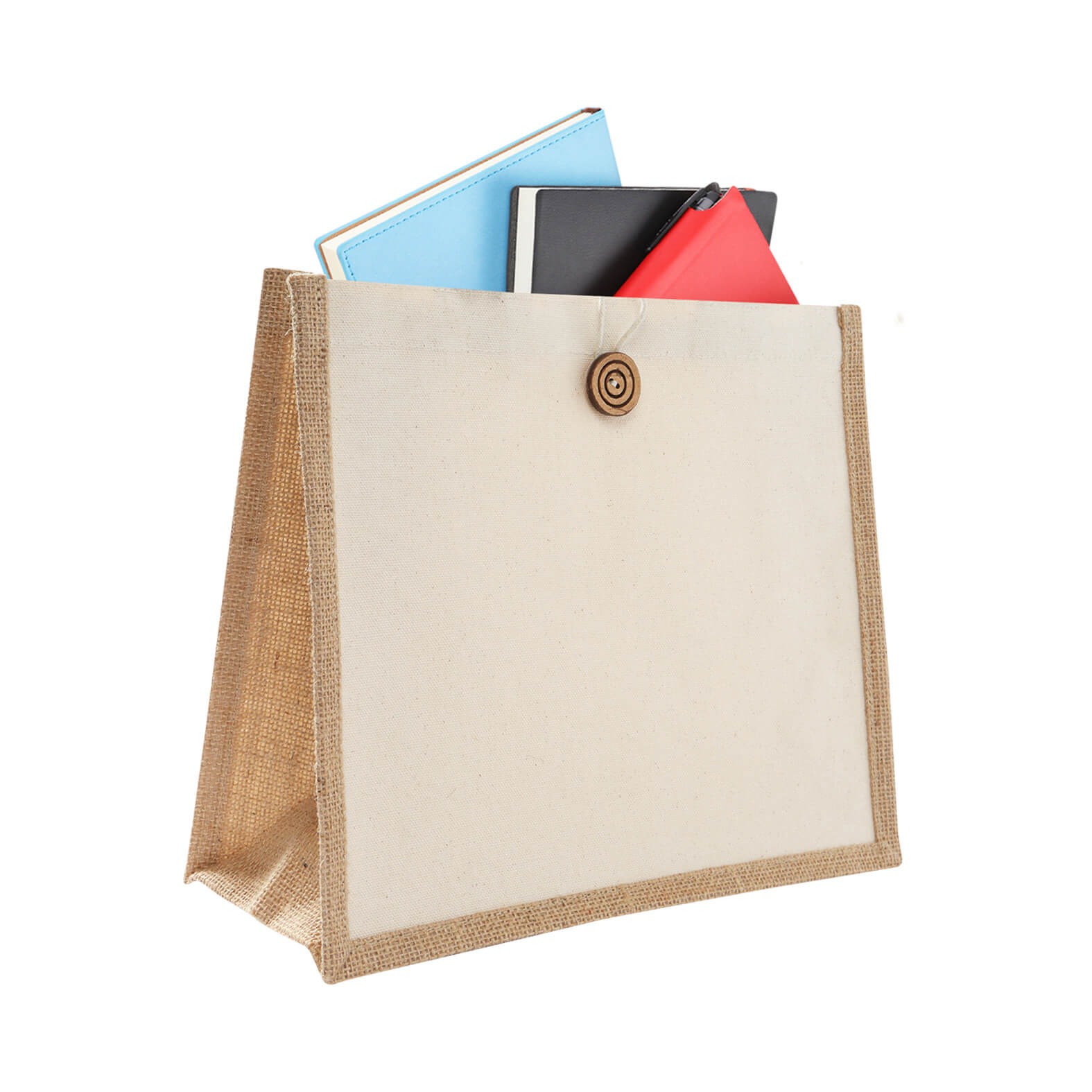 YAM Bolsa de loneta laminada con yute de 1 compartimento con botón para cierre y asas.
