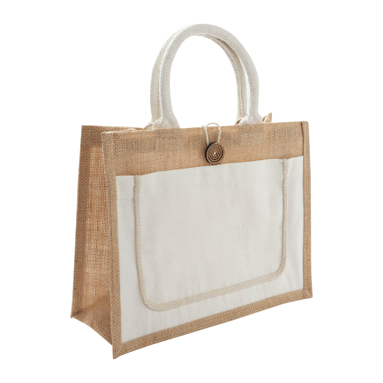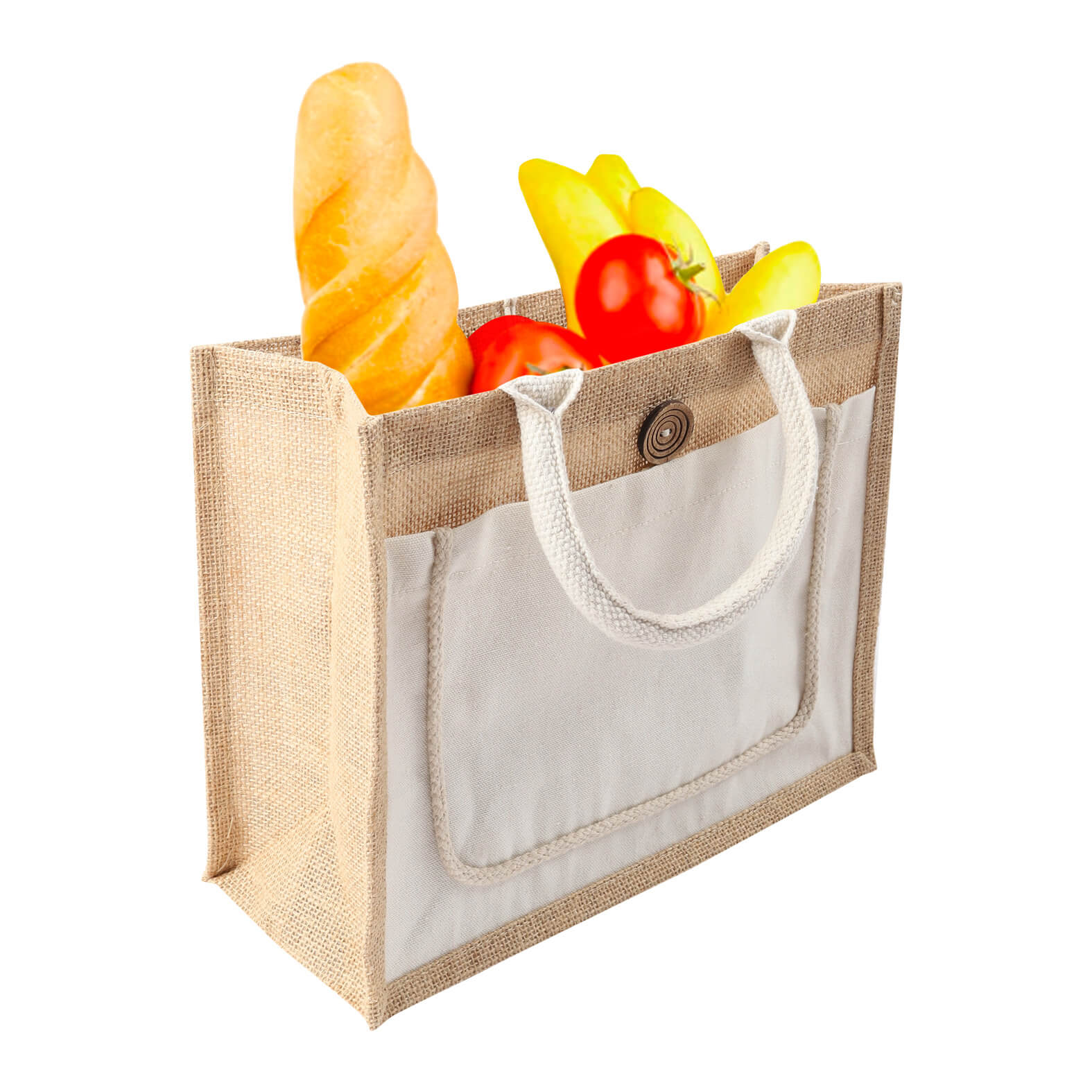 TIKA Bolsa de yute laminado con 1 compartimento principal con botón para cierre, 1 frontal de algodón con velcro y asas.
