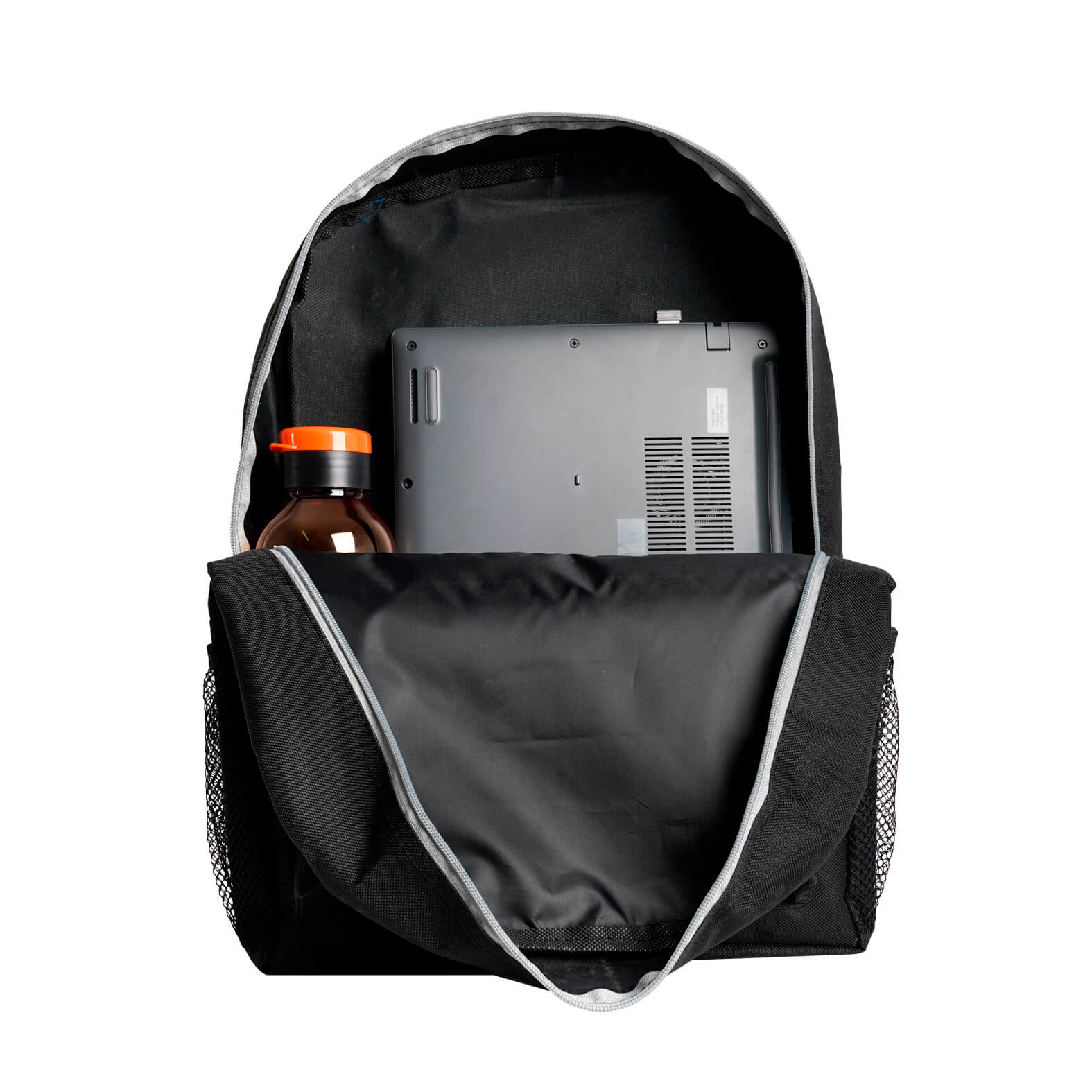 FINIK Mochila con compartimento principal, bolsa frontal con cierre, dos mallas laterales, asa superior y correas ajustables.