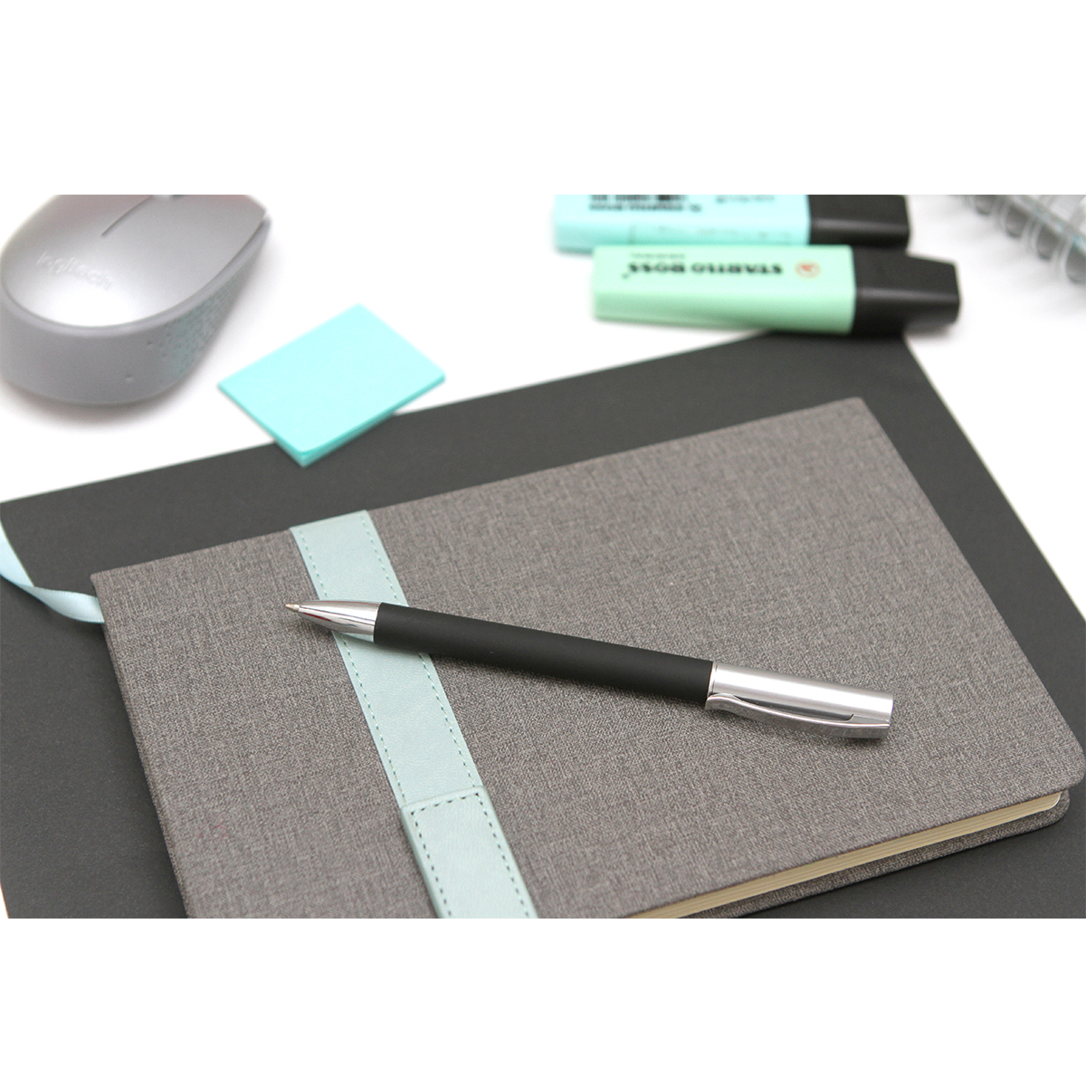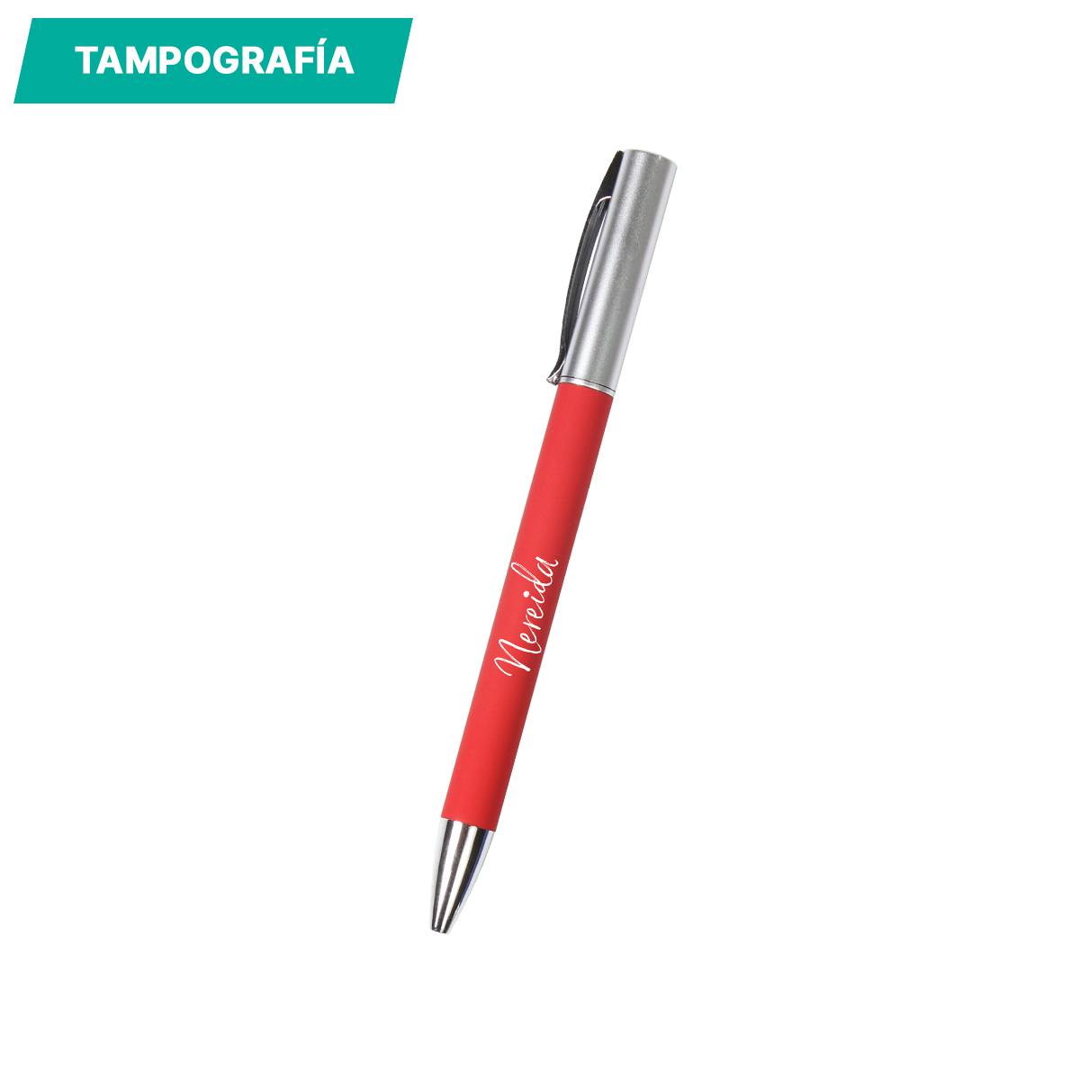 Bolígrafo en terminado rubber Castilla. - Bolígrafo twist con barril en terminado rubber con clip, punta metálicos y tinta de escritura negra. El rubber proporciona un acabado suave y agradable al tacto.