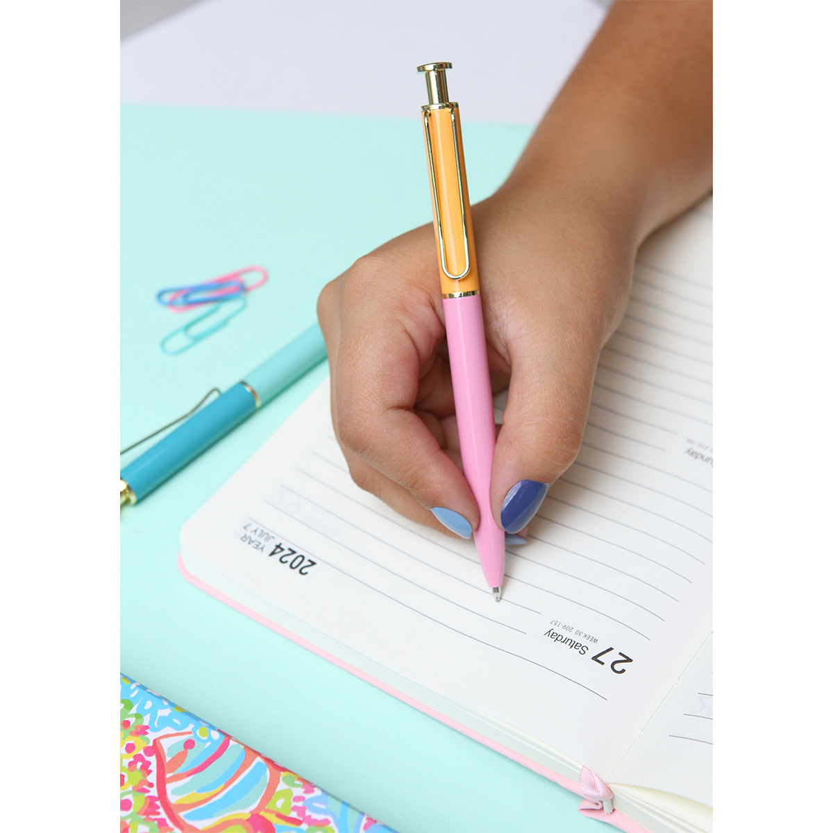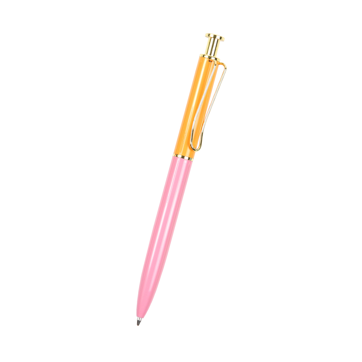 Bolígrafo Melk. - Bolígrafo con acción de empuje, barril fabricado de acero inoxidable con acabado brillante, botón de empuje y clip color dorado. Tinta de escritura negra.