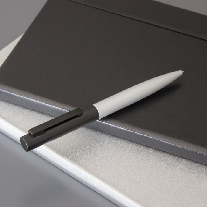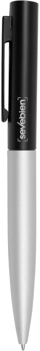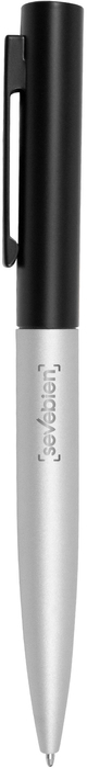 BOLÍGRAFO "PINTACS" Cuerpo metálico plata mate. En la parte superior color negro con clip del mismo color. Apertura giratoria. Tinta negra.