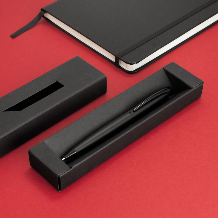 BOLÍGRAFO "DANKE". Cuerpo de aluminio con acabado mate. Clip, anillo central y puntera de hierro con acabado brillante. Cartucho metálico de origen alemán. Tambor superior con revestimiento galvánico. Apertura giratoria. Tinta negra. Presentación en caja de regalo.