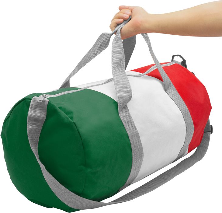 Bolso "WORKOUT MEX" Bolso deportivo con los colores de la bandera mexicana. Amplio compartimento principal y cierre transversal en color gris. 2 asas y correa ajustable color gris