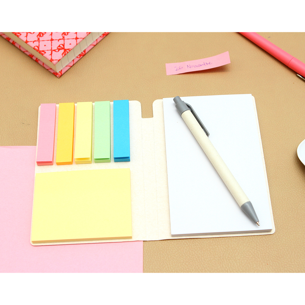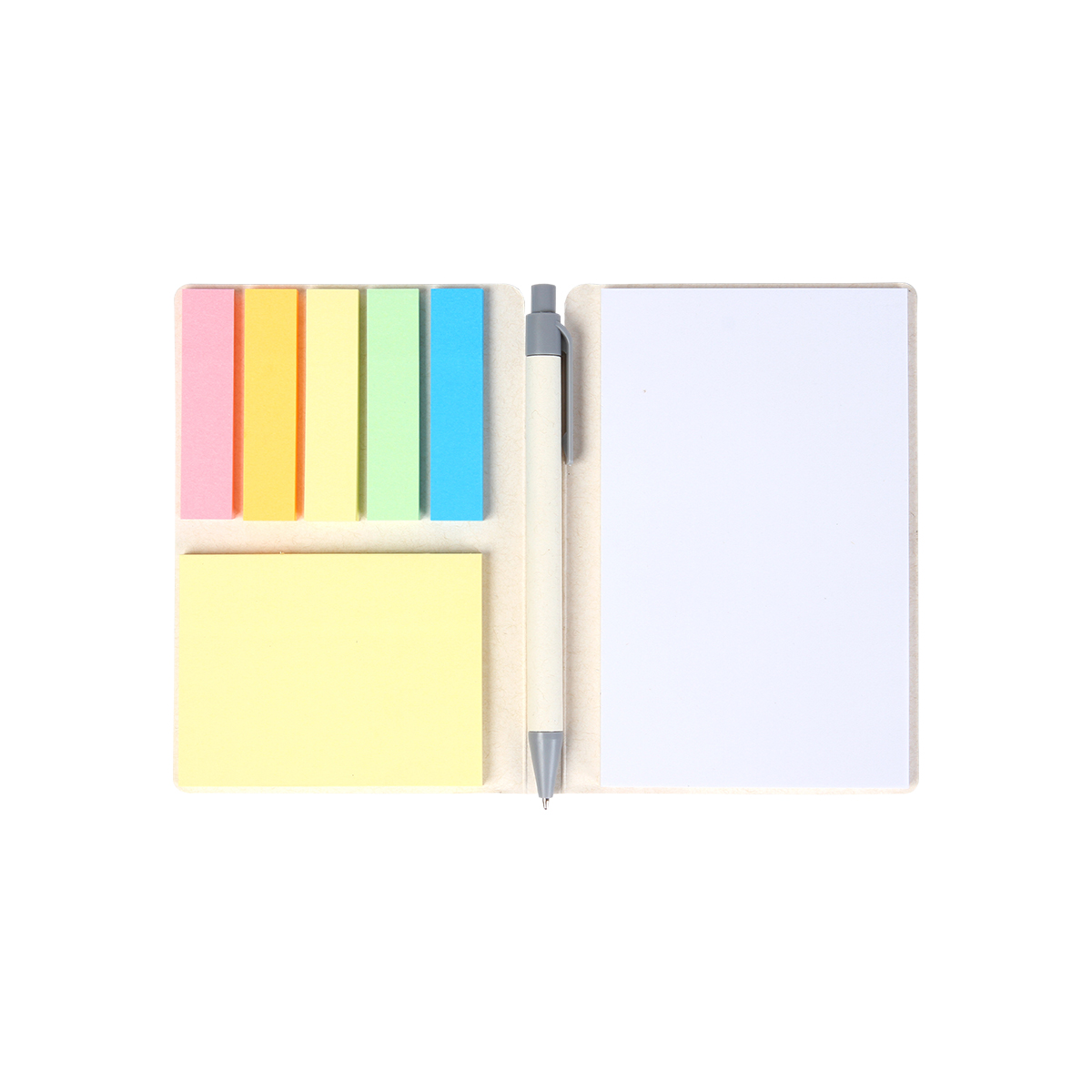 Block de notas Midfield - Block de notas adhesivas con cubierta fabricada en papel de leche. Incluye 6 colores con 50 hojas adhesivas, 50 hojas interiores en blanco y 1 bolígrafo estilo barril fabricado en cartón de leche con tinta de escritura negra. Perfecto para organizar, estudiar o regalar.