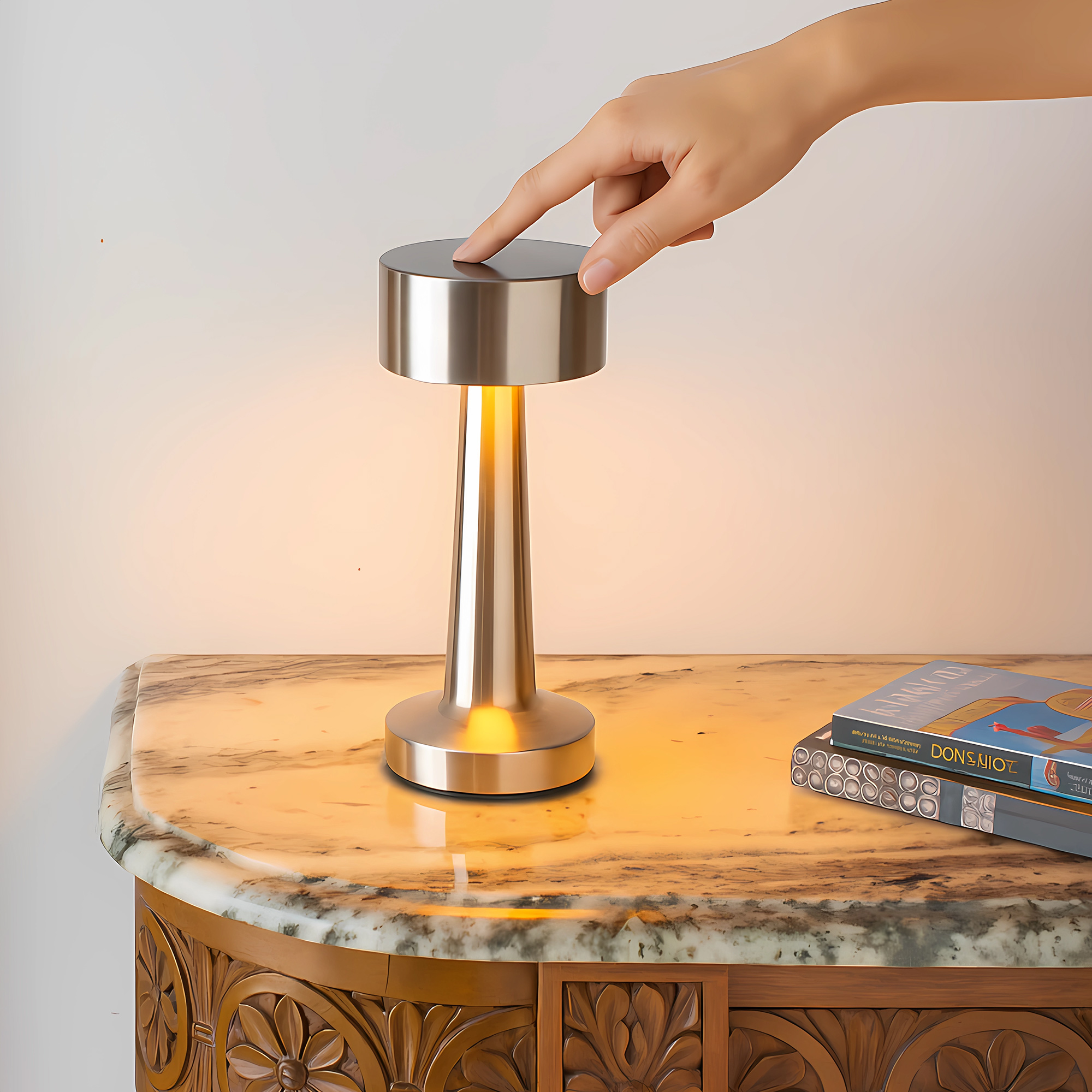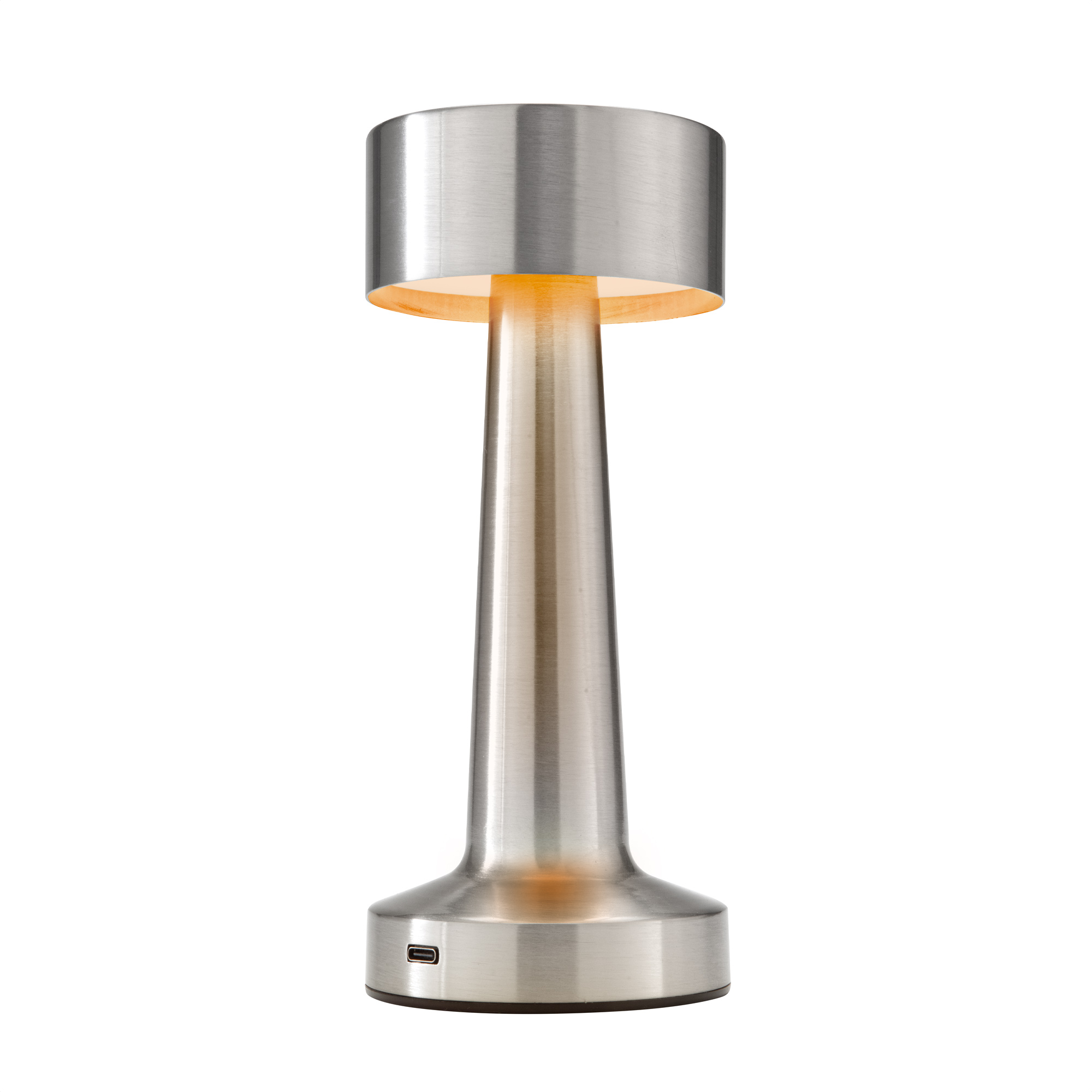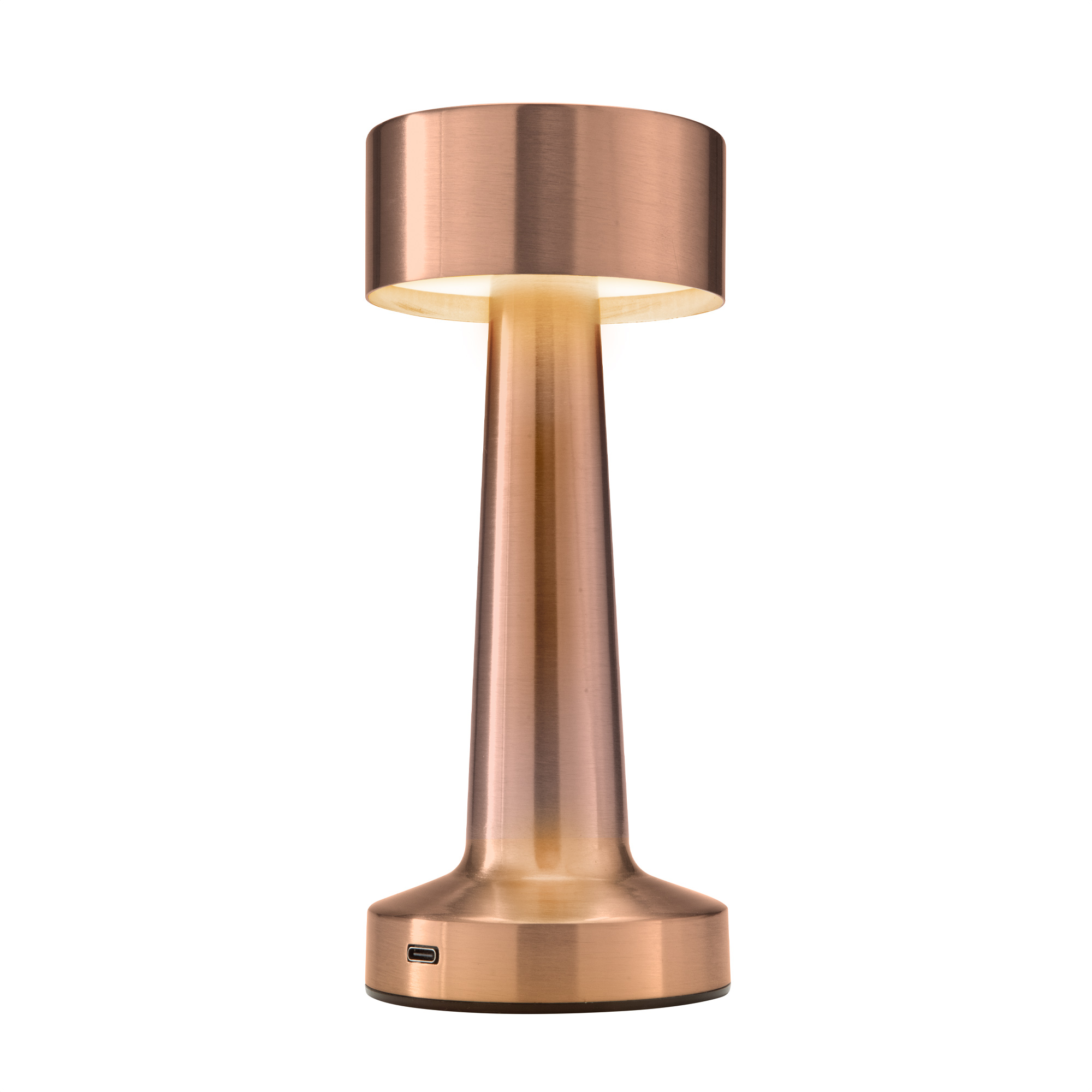 ámpara "DAMBEL" Lámpara. Luz led. Botón táctil de encendido/apagado que regula la intensidad y cambia tres modos de luz (cálida, blanca y blanca cálida). Pintura con acabado mate (color negro) y con acabado brillante (plata y cobre). Batería de litio recargable. Conexión USB-C. Incluye cable de carga color negro