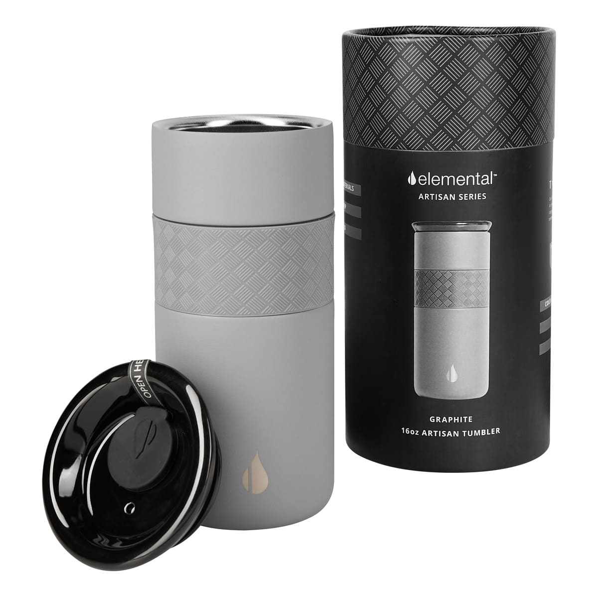 TERMO ARTISAN - Tecnología TrueBarrier™ que usa aislamiento de triple pared. Doble pared de acero inoxidable y una capa de revestimiento de cobre. Cerrado al vacío. Material BPA free. Tapa de cerámica con tapón de seguridad, su forma evita derrames y quemaduras al tomar. Banda de silicón texturizada antiderrapante. Compatible con portavasos. Base antiderrapante. Mantiene temperatura caliente 6 hrs y fría 18 hrs aproximadamente. Incluye caja individual.