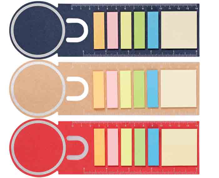 UNIX - Separador de libros de cartón con regla impresa, extremo circular para impresión de logotipo. Contiene 5 líneas de banderas adhesivas y un block de notas cuadrado.
