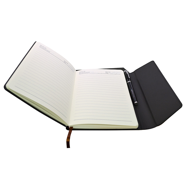 l Incluye libreta y bolígrafo en estuche de presentación. l Libreta con 80 hojas rayadas y planeador atemporal. l Cinta divisoria. l Cierre con ceja magnético y placa para personalizar. l Bolígrafo de metal con mecanismo rotativo. l Colores: Negro.
