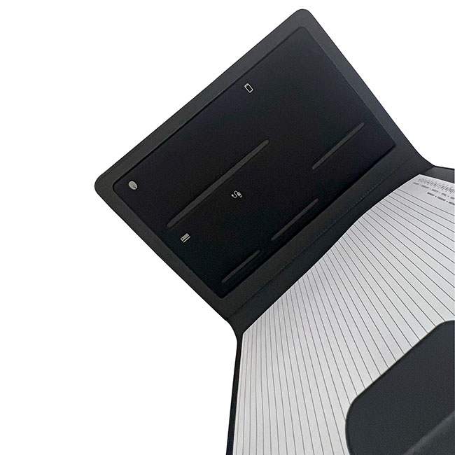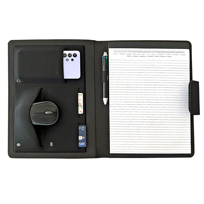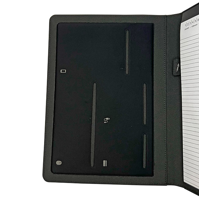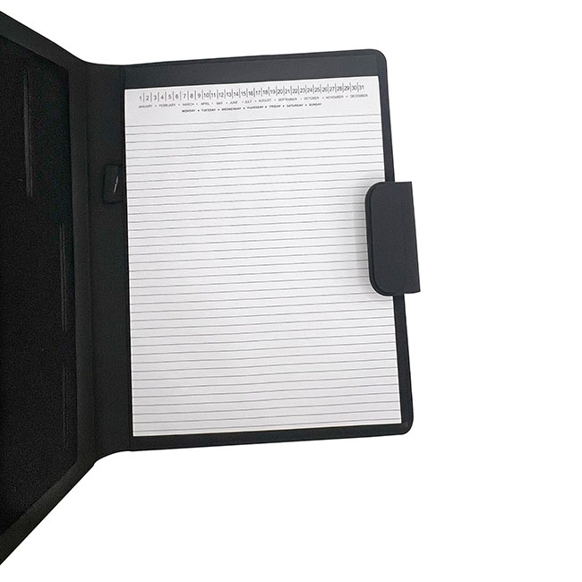 Porta Documentos Ginebra Porta Documentos Ginebra l Incluye block de hojas rayadas. l Interior con portabolígrafos y compartimentos organizadores l Ceja en cierre magnético l Detalle de placa para personalizar l Colores: Negro Material: PET reciclado Medida: 31 x 23 cm Impresión: Serigrafía Área de Impresión: 10 x 4 cm