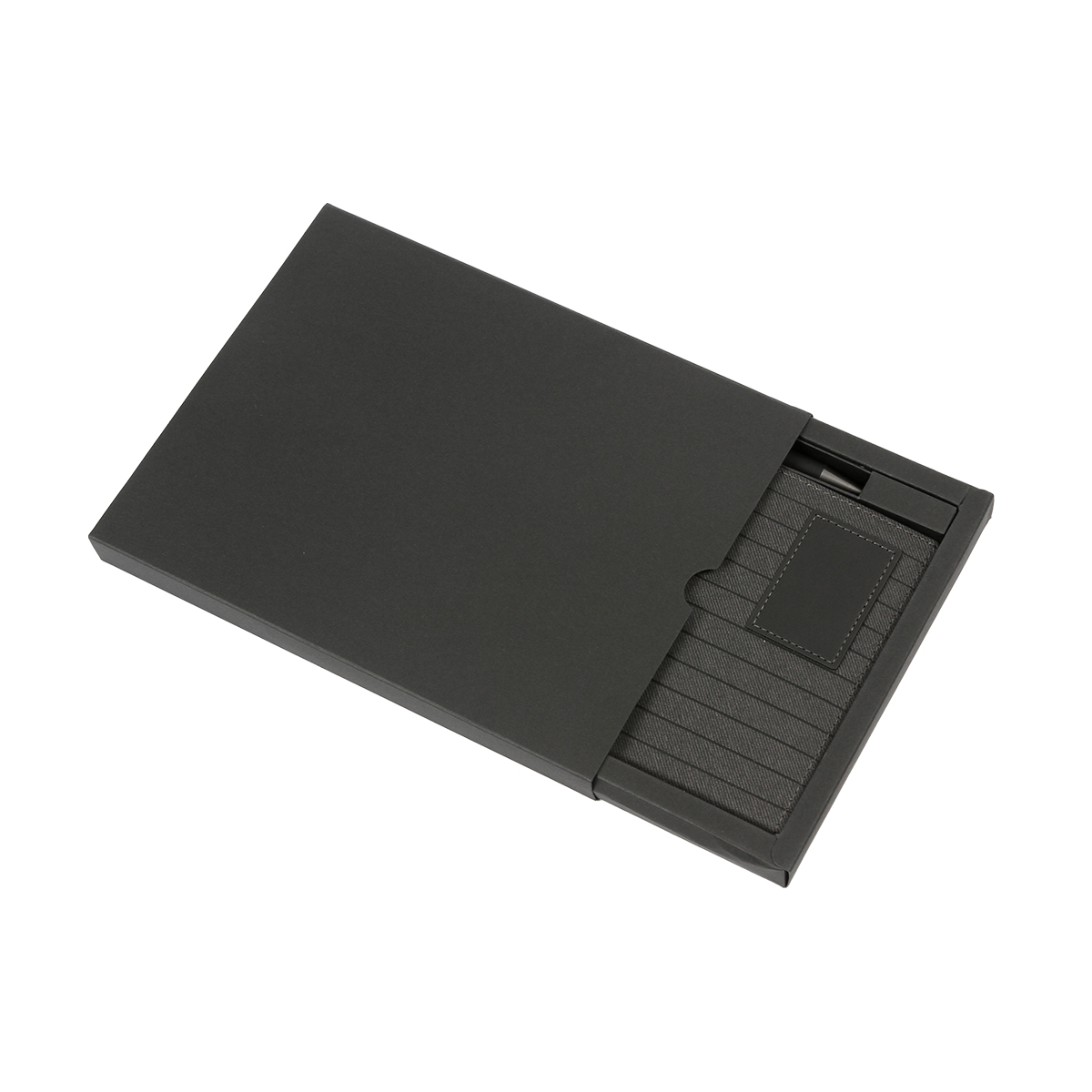Set Mauron. - Set ejecutivo, incluye bolígrafo y libreta tamaño A5 con cubierta fabricada en PU (curpiel) con una etiqueta rectangular cosida en la esquina inferior derecha. Interior 135 hojas blancas de 80g. Incluye caja de regalo color negro.