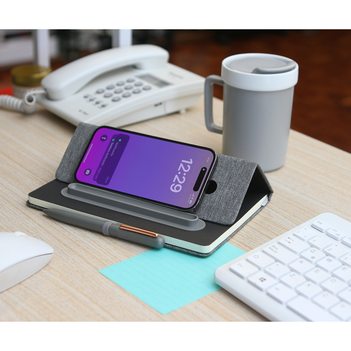 Libreta ejecutiva Beignon. - Libreta ejecutiva fabricada en tela PET reciclado con 80 hojas de 70g. Su cubierta funciona también como soporte para teléfono e incluye un imán para poder colocar el bolígrafo tipo twist con barril fabricado en plástico y latón también con imán. Tinta de escritura negro.