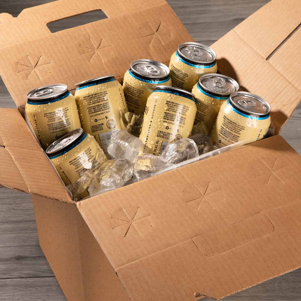 HIELERA BRISSAC - Hielera de cartón con recubrimiento impermeable. Liviana, reutilizable y fácil de armar. Interior plastificado con bolsa biodegradable. Soporta un peso de hasta 10 Kg. Capacidad de 24 latas, 12 botellas de vidrio o 6 Botellas de 1 litro.