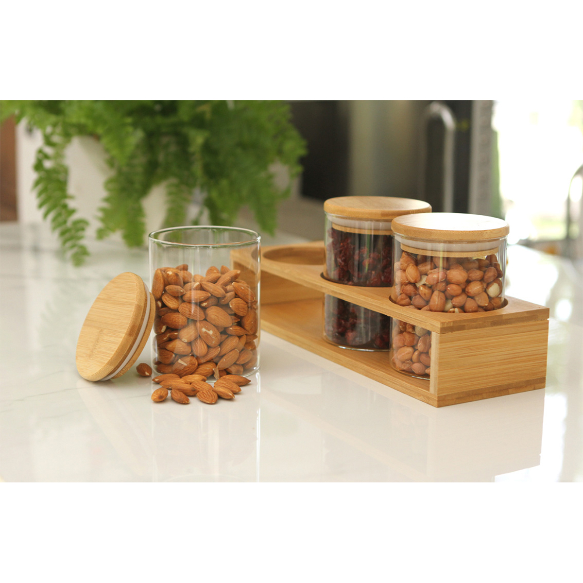 Juego de contenedores Horki. - Set de 3 contenedores de 500 ml fabricados en vidrio de borosilicato con tapa y base de bambú. Incluye caja de cartón individual. Mantén tus alimentos siempre frescos con el sistema de cerrado hermético.