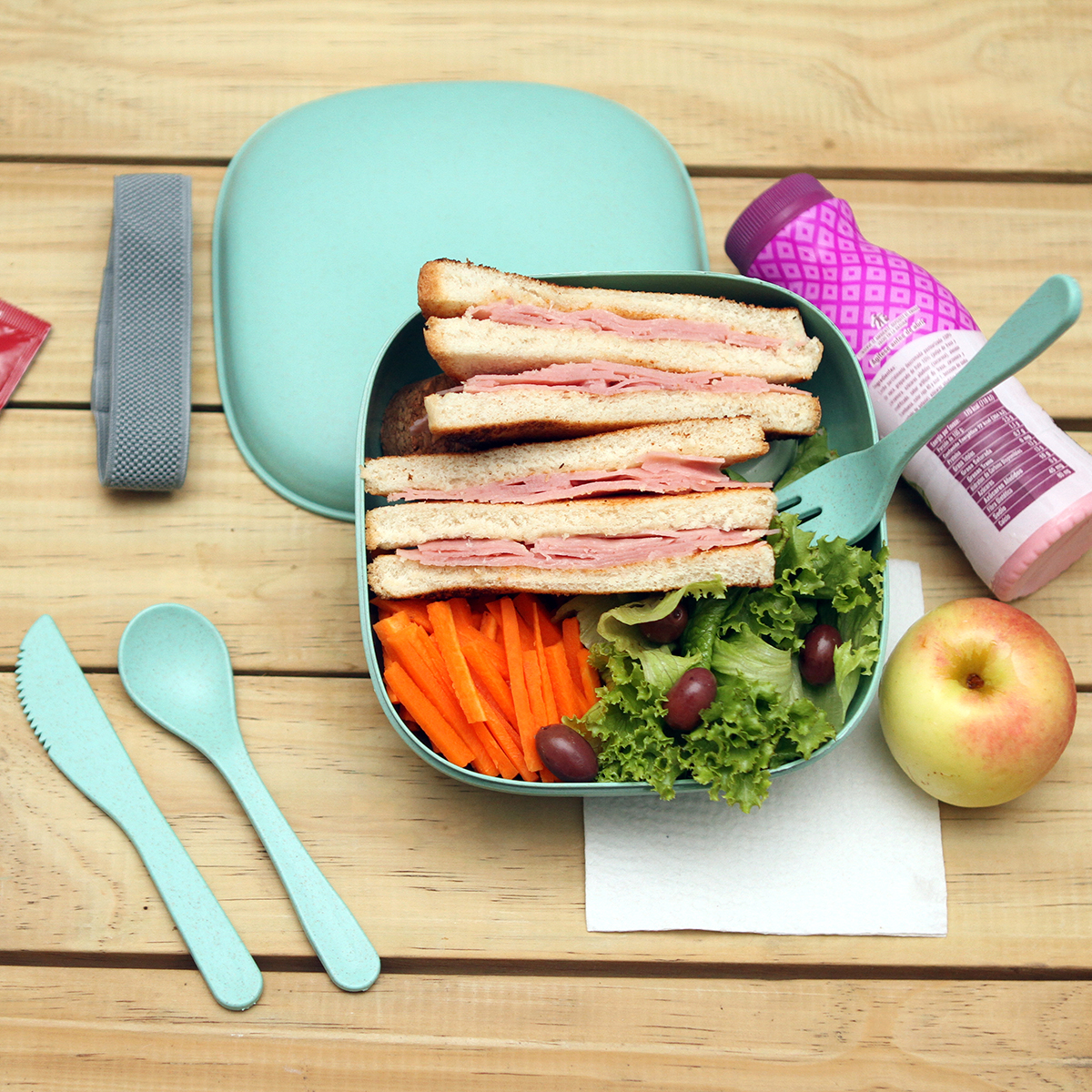 Contenedor Iringa. - Contenedor fabricado en fibra de trigo y plástico, cuenta con cubiertos  (cuchara, tenedor y cuchillo) fabricados en el mismo material. Este es un material ecológico, resistente, liviano y no tóxico, lo que la convierte en una elección segura y confiable. Además, está equipado con una banda elástica que lo mantiene seguro y evita derrames o fugas accidentales.