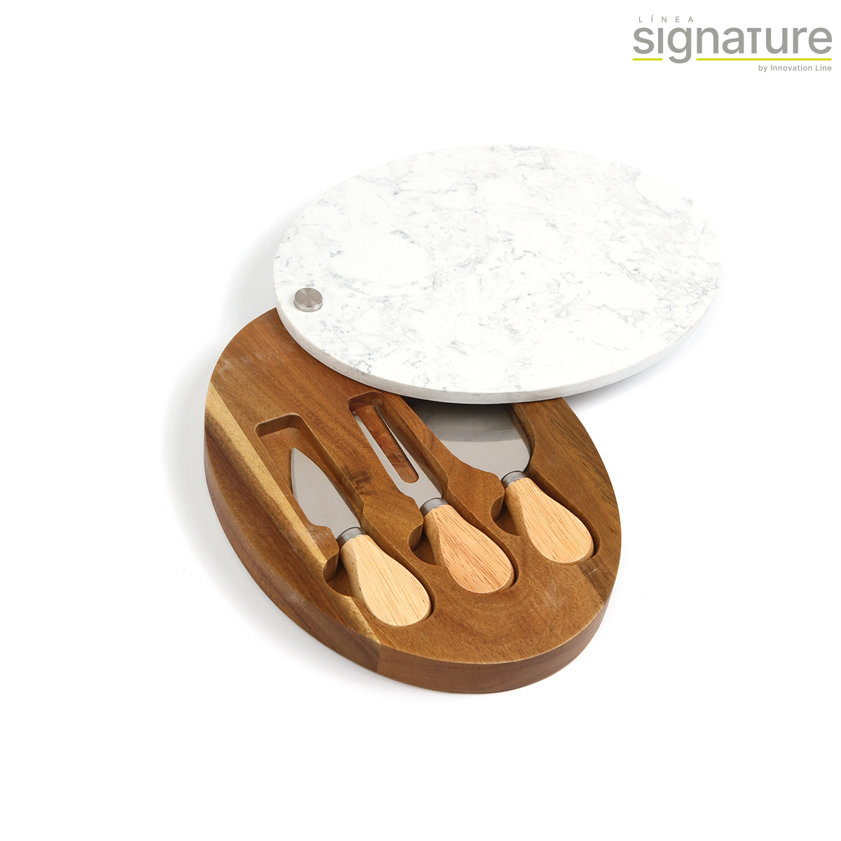 Set de quesos Pikine. - Set para quesos fabricado con madera de acacia y mármol gris. En el interior de la tabla cuenta con tres compartimentos para guardar chuchillo, espátula y trinche para quesos. Personalizable para que puedas regalar algo único y especial.