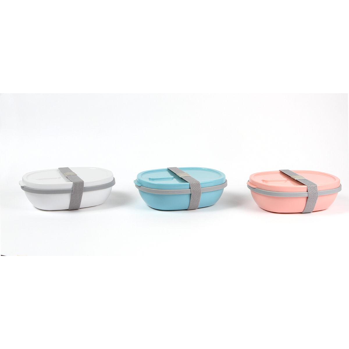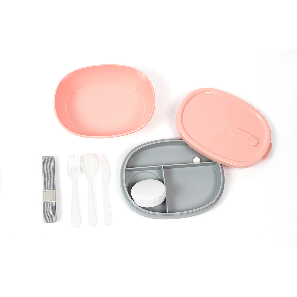 Contenedor Kuhtai. - Contenedor fabricado en polipropileno, contiene tres cubiertos del mismo material, con un separador, un contenedor más pequeño para aderezos, salsas, etcétera. Una tapadera y una liga para poder asegurar el correcto cierre del contenedor. Capacidad 800 ml.