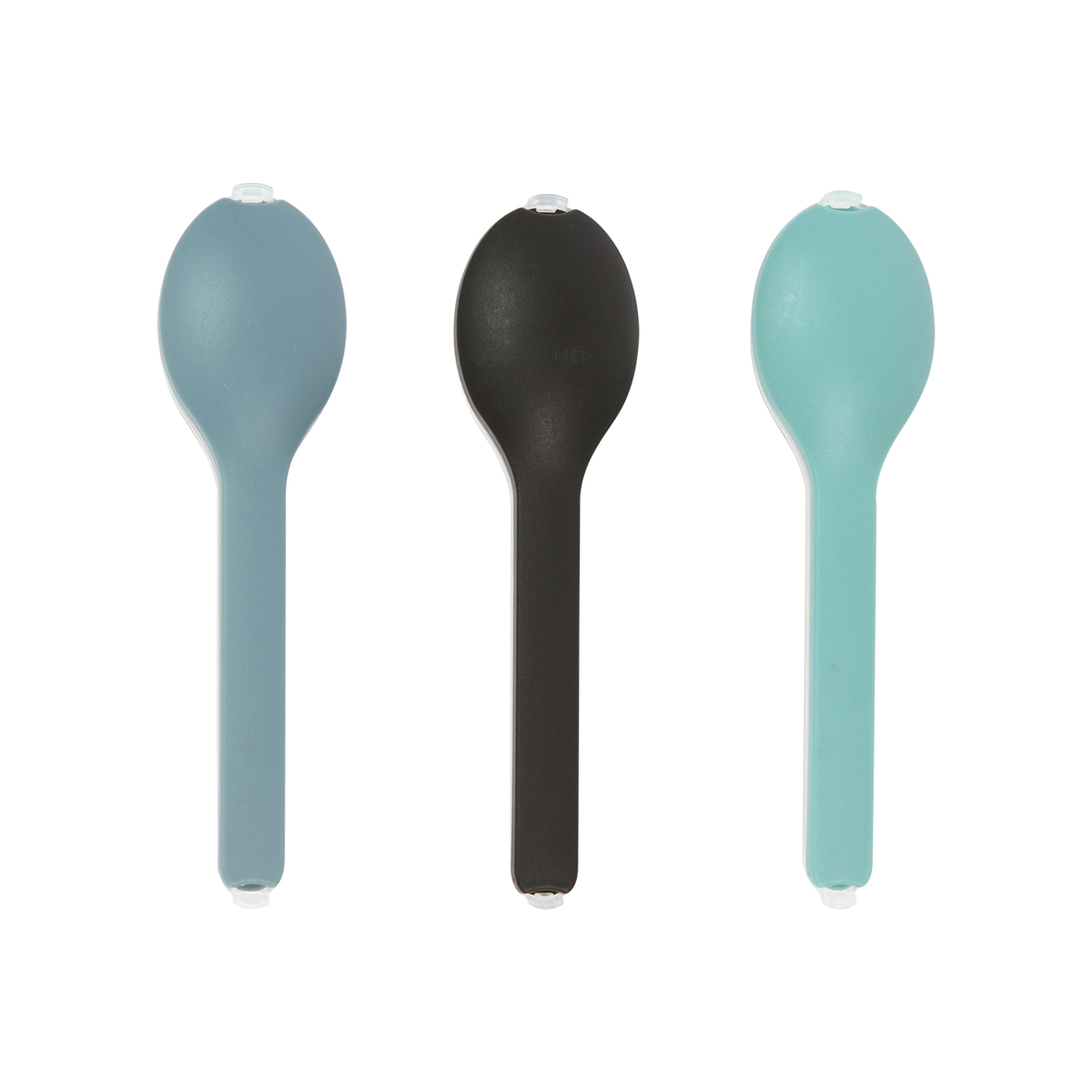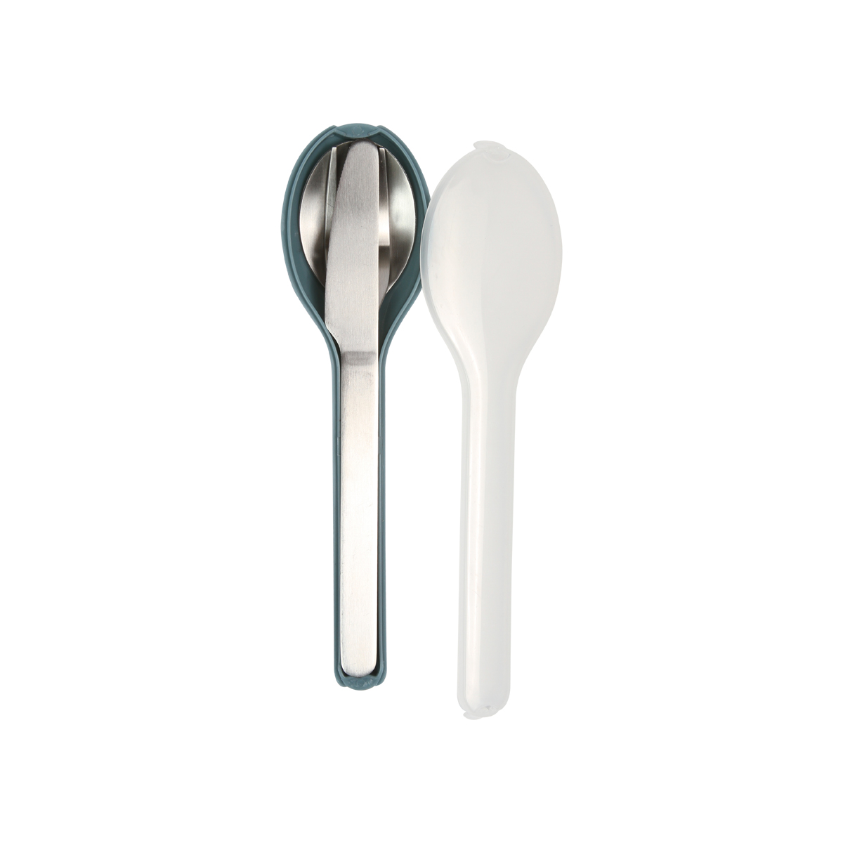 Juego Lachy. - Juego de utensilios fabricados en acero inoxidable, incluye cuchara, tenedor y cuchillo. Su estuche en forma de cuchara fabricado en polipropileno con tapa traslúcida ayuda a resguardarlos mejor.