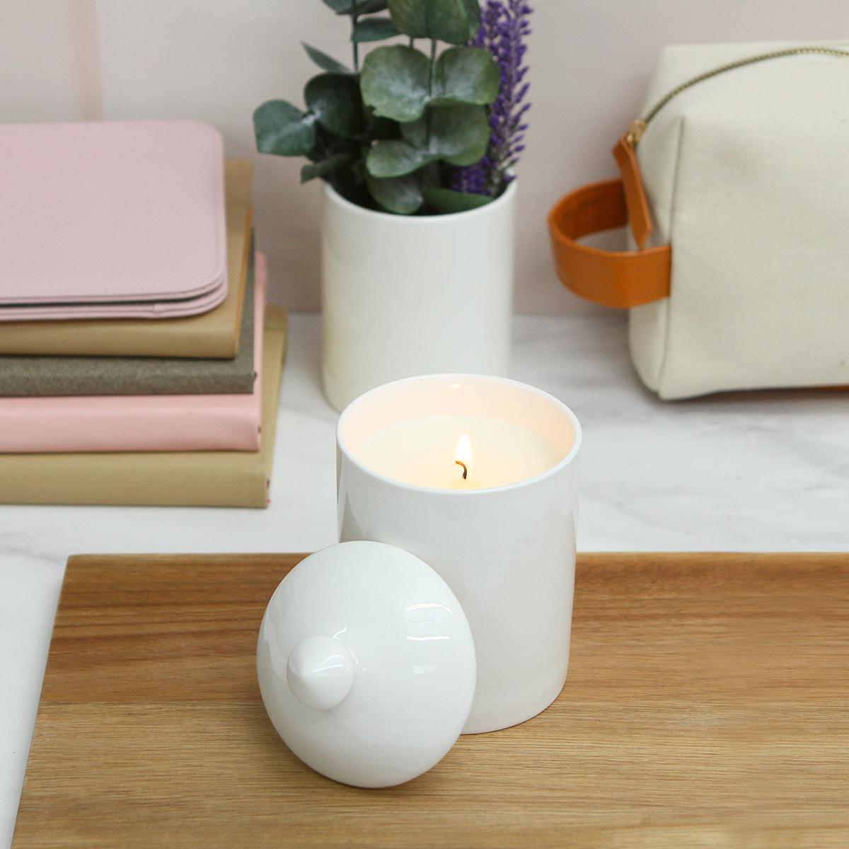 Vela Gersau. - Vela aromática fabricada en cera de soya, concentración del 5 % de esencia de limón. La cera de soya es conocida por su capacidad de quemarse más lentamente y de manera más uniforme en comparación con otras ceras, lo que garantiza que la vela tenga una mayor duración y un rendimiento óptimo de su fragancia. Su contenedor de cerámica con diseño sofisticado y su tapa del mismo material hace que sea ideal tanto para el uso en hogares como en ambientes profesionales.