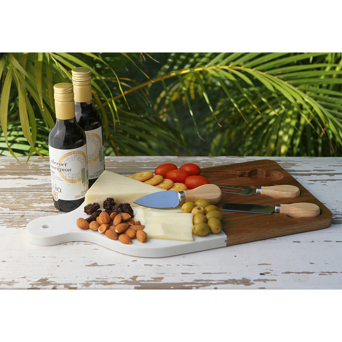 Tabla de quesos Cézy. - Tabla de quesos fabricada en madera de acacia con recubrimiento de laca mate y mármol. Cuenta con tres suajes de cuchillo, espátula y trinche para quesos con mango de madera de acacia y acero inoxidable. Diseñada para servir quesos, botanas o aperitivos con un estilo elegante y moderno.