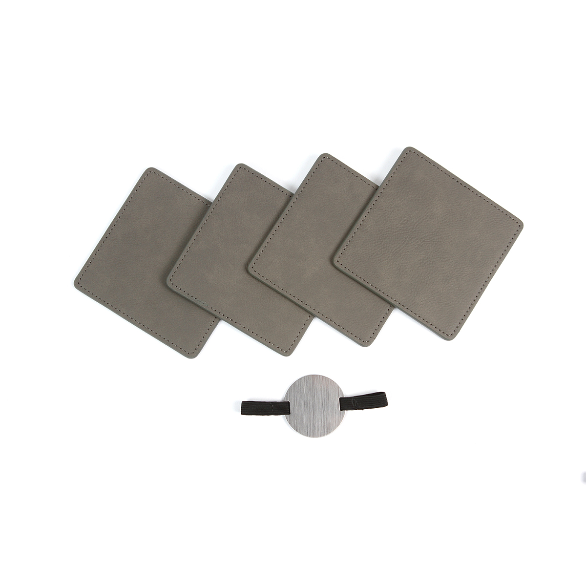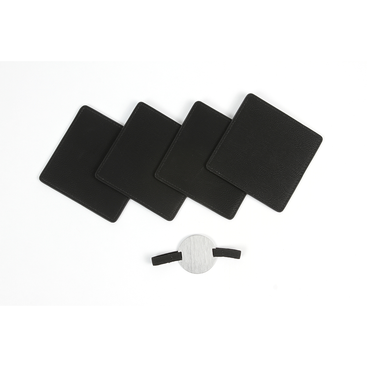 Juego de porta vasos Toffen. - Juego de 4 piezas de porta vasos fabricado en curpiel, forma cuadrada, prácticos y elegantes, fáciles de limpiar y de guardar, ya que cuentan con una banda elástica con una placa de metal circular. Accesorios funcionales que ayudan a mantener el orden y evitar derrames en diversas superficies como escritorios, mesas o muebles del hogar. Ofrecen soporte estable para tazas, botellas y vasos, protegiendo contra manchas, humedad y ralladuras. Además, aportan un toque decorativo y práctico al espacio, siendo ideales tanto para el hogar como para oficinas.