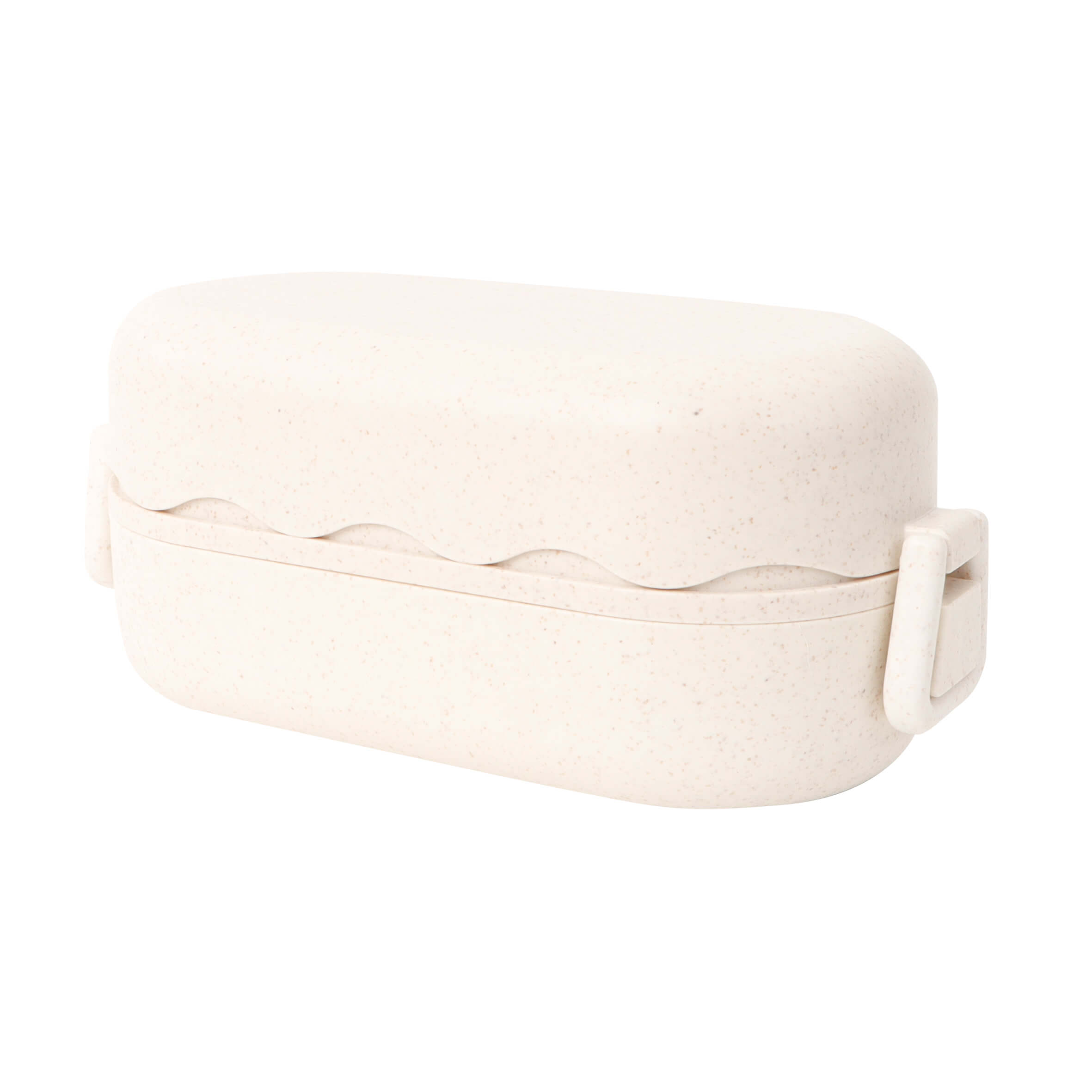 RISOTTO Contenedor de alimentos con dos compartimentos principales, separador de comida, cuchara y broches laterales.