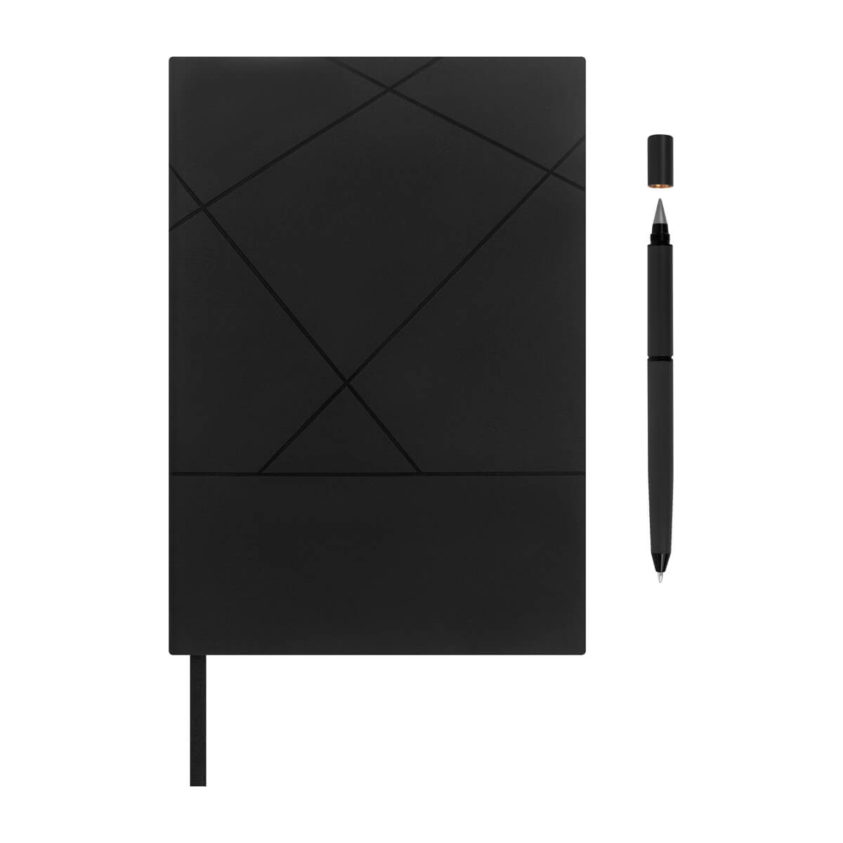 SET DE LIBRETA TIMANTTI - Elegante y original set de regalo que consta de libreta con 100 hojas a rayas, cubierta rígida de curpiel y listón separador. Como complemento, cuenta con un bolígrafo de metal con terminado mate, con punta clásica y la funcionalidad de un lápiz infinito en la parte superior. Incluye caja de regalo con cierre imantado y asas de fino material, que le dan un toque más sofisticado.