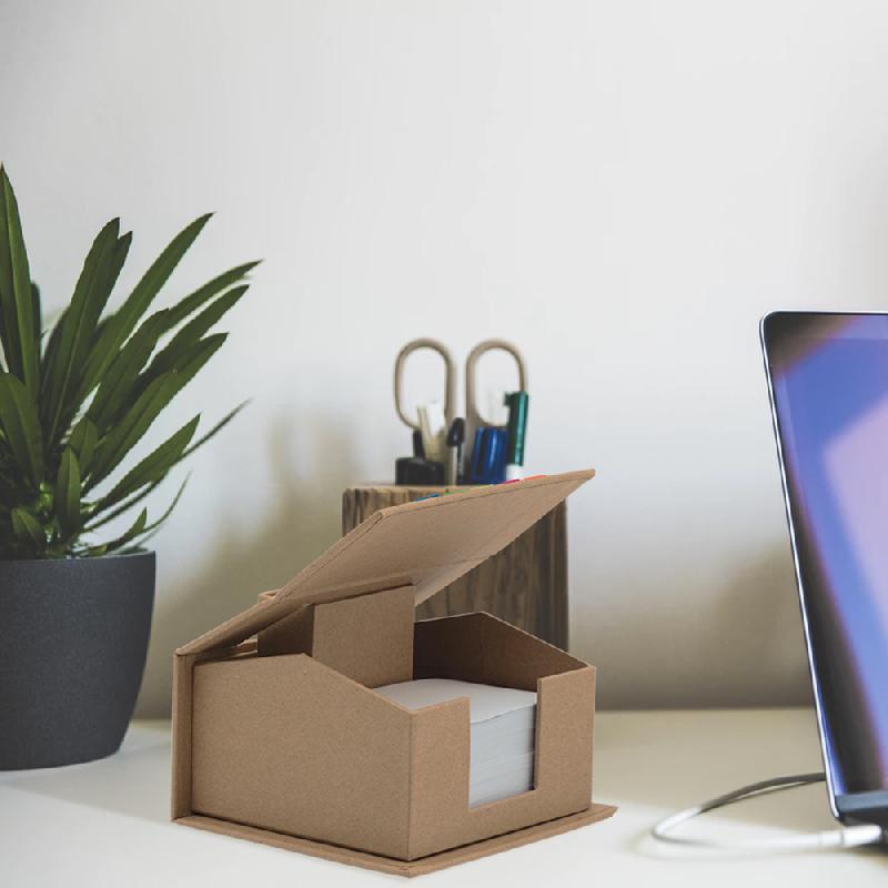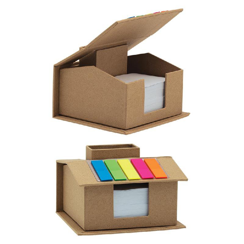 Organizador de escritorio en forma de casa con porta lápices, banderines y hojas blancas. Medidas: 11.5 x 10 x 7.5 cm Material: Papel kraft y cartón. Empaque: TBC