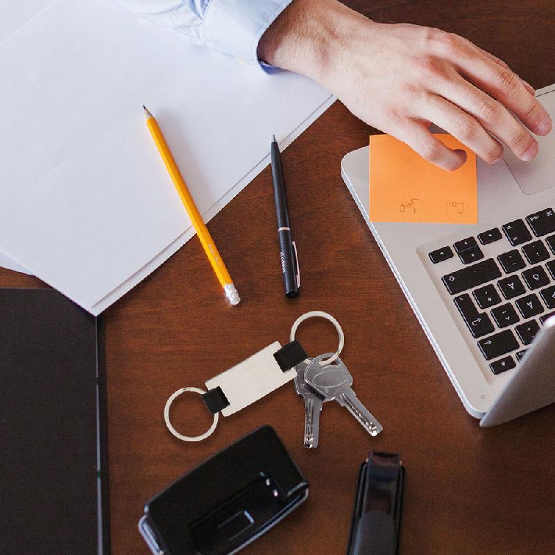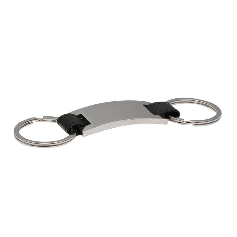 Llavero con 2 argollas, cinta de piel y acabado tipo espejo. Medidas: 2.6 cm x 7 cm Material: Metal. Empaque: Caja de cartón.