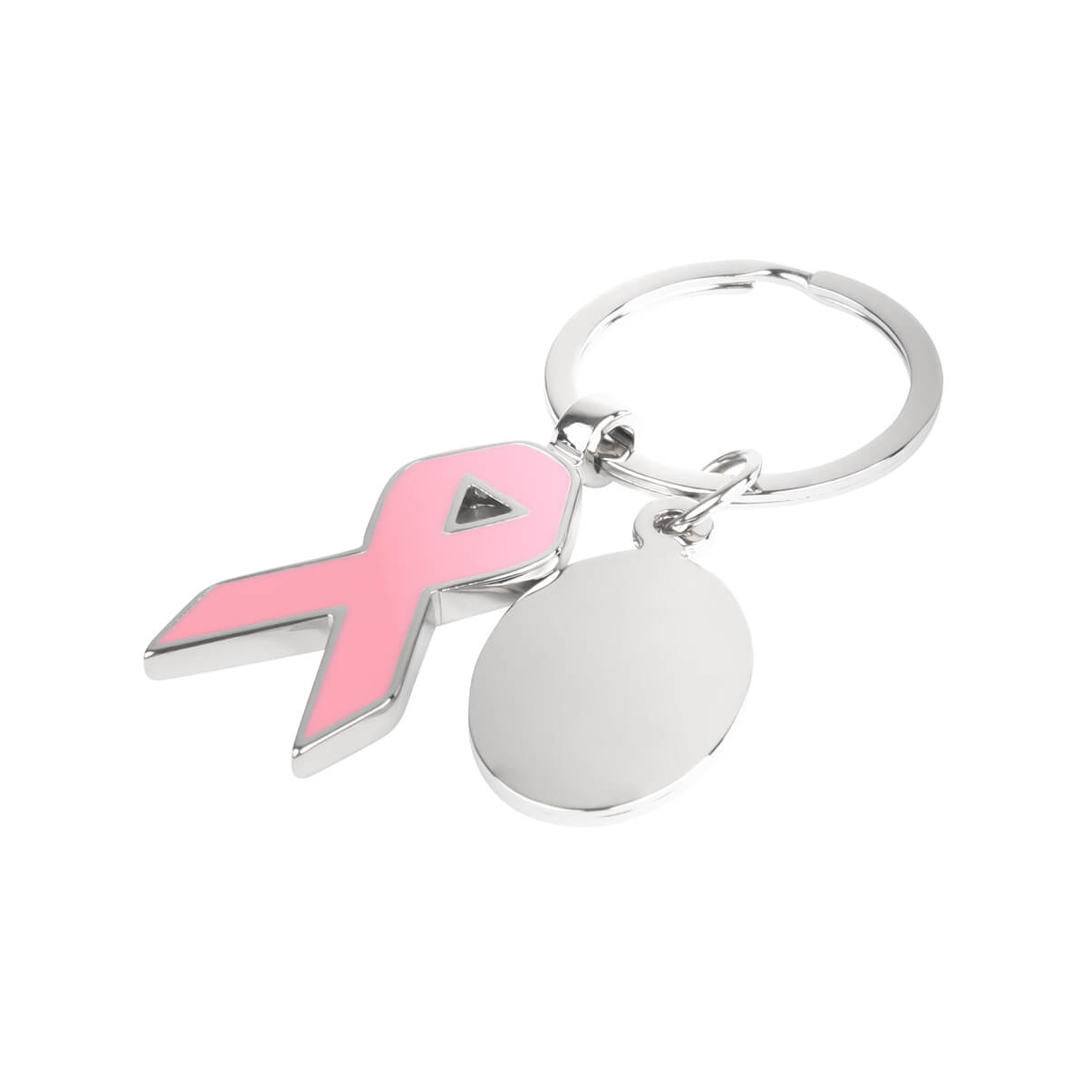 LLAVERO ROSAE - Llavero metálico con diseño en forma de listón rosa y placa redonda para grabado. Símbolo de apoyo y concientización del cáncer de mama. Personalízalo con una fecha especial, un nombre o el mensaje que desees. Además de mantener tus llaves organizadas, es un accesorio elegante, significativo y funcional.
