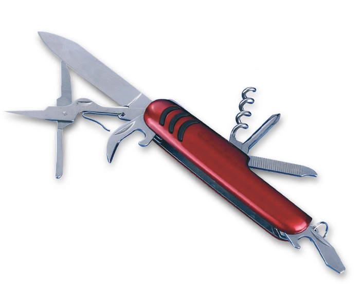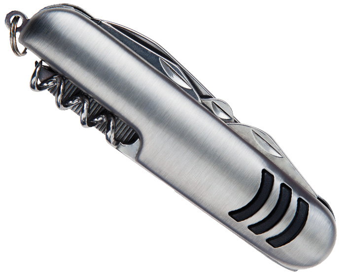SMART - Navaja multifuncional. Incluye: desarmador de cruz, destapador, abrelatas, tijeras, sacacorchos y arillo para llavero. Incluye funda. Presentación: caja en color plata.